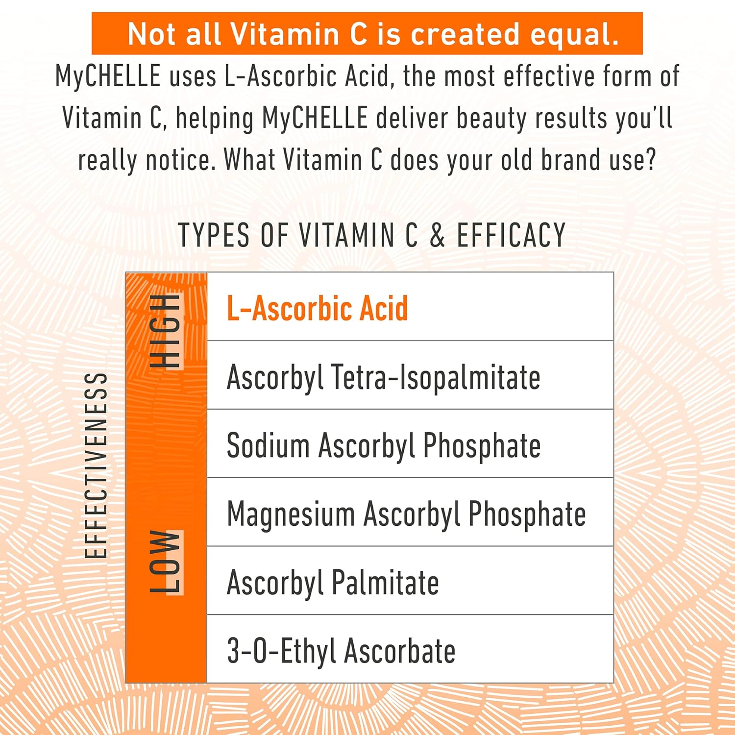 - HIGHLY EFFECTIVE VITAMIN C SERUM: MyCHELLE uses L-Ascorbic Acid, the most effective form of Vitamin C, for results you will truly notice