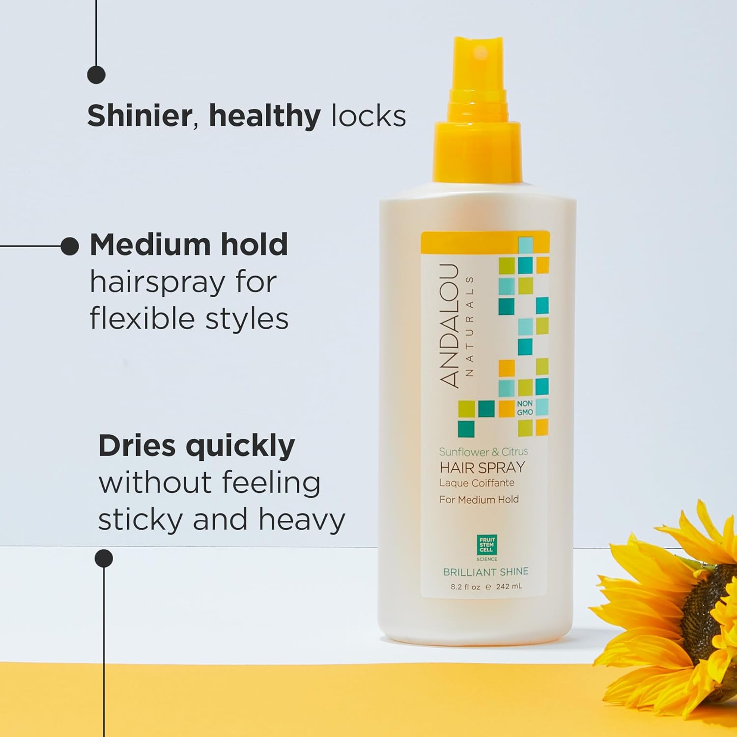 Andalou Naturals Sunflower & Citrus Brilliant Shine Hair Spray | Styling for Shine & Medium Hold | Aloe Vera for Frizz Control | Natural & Cruelty Free | 8.2 fl oz