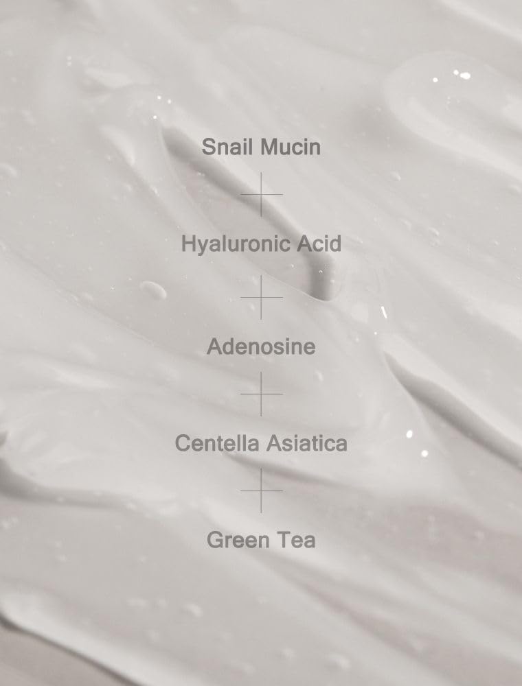 - Snail Mucin: Mucin in snail secretion helps to repair damaged skin and gives clear and smooth skin. The snail gel cream absorbs quickly thanks to the fresh and lightweight formula and reinforces skin repairment