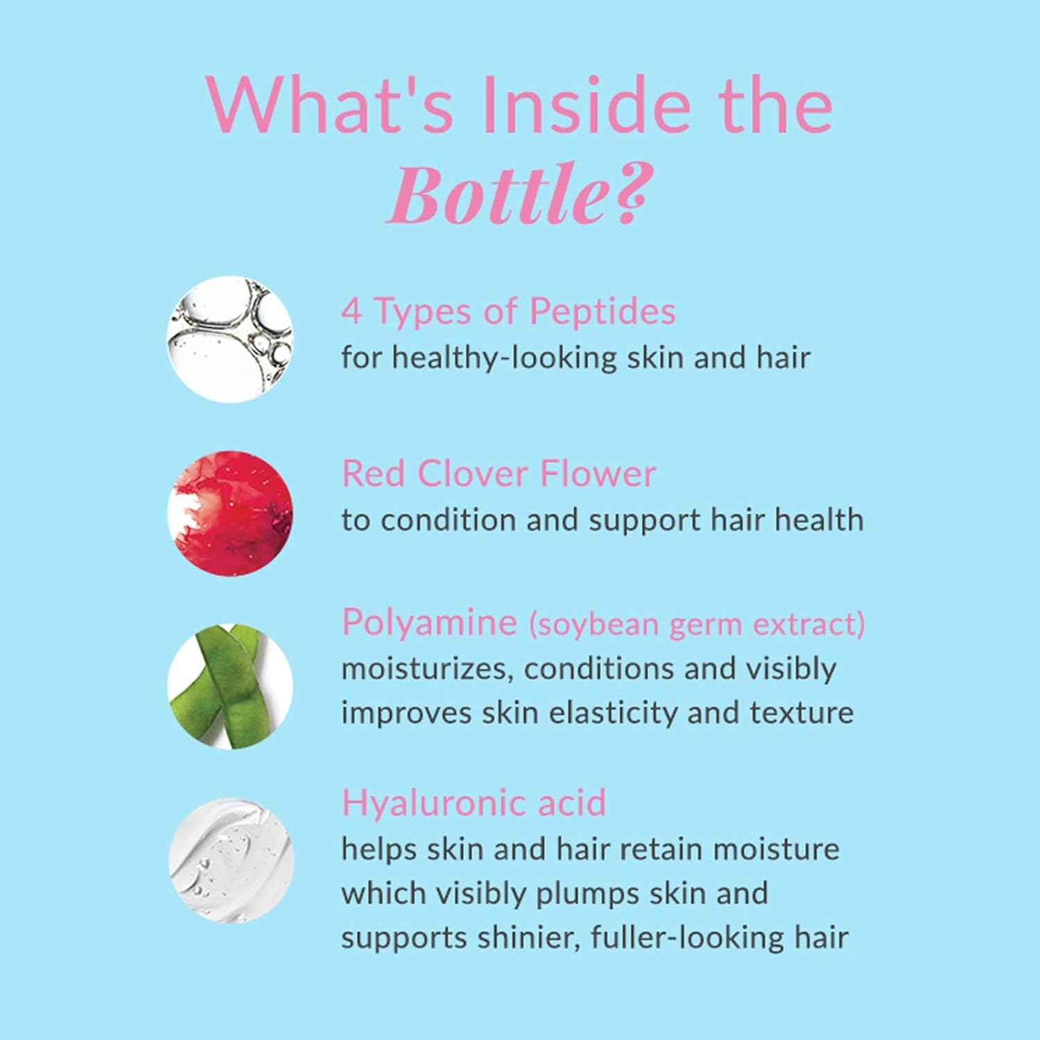 - Special Ingredients : 4 Types of Peptides: Support healthy-looking skin and hair., Hyaluronic Acid: Helps nourish dry and damaged lashes with hydrating properties to help skin and hair retain moisture. Visibly plumps skin and supports shinier, fuller-looking hair., Polyamine (soybean germ extract): Helps moisturize, condition and visibly improve skin elasticity and texture., Red Clover Flower Extract: Powerful antioxidant with a high content of isoflavones that is known to support hair health. 4 Types of Peptides: Support healthy-looking skin and hair., Hyaluronic Acid: Helps nourish dry and damaged lashes with hydrating properties to help skin and hair retain moisture. Visibly plumps skin and supports shinier, fuller-lo… See more