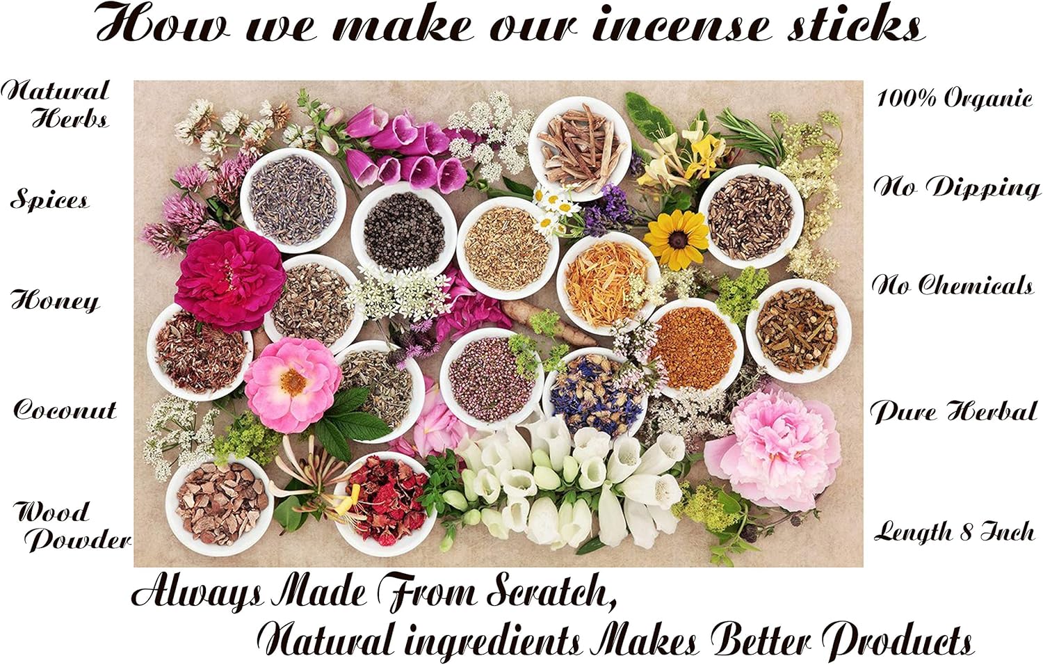 - 100% NATURAL -Nag Champa Natural incense Sticks completely handmade MADE FROM SCRATCH by blending natural resins, Herbs, Spices with aromatic wood powders, charred coconut powder fragrant oils and honey.No Dipping in Toxic Chemicals.