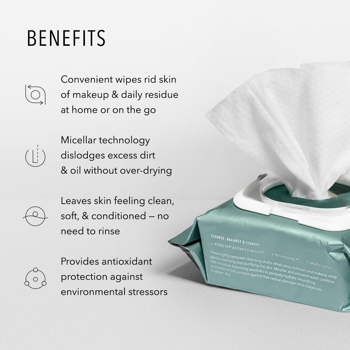 - Lightly Textured: Convenient cleansing cloths whisk away pollution and makeup in one clean sweep. Micellar and HydrO18 Activated Water merge with moisture-balancing peptides to provide hydration while removing visible and invisible residue