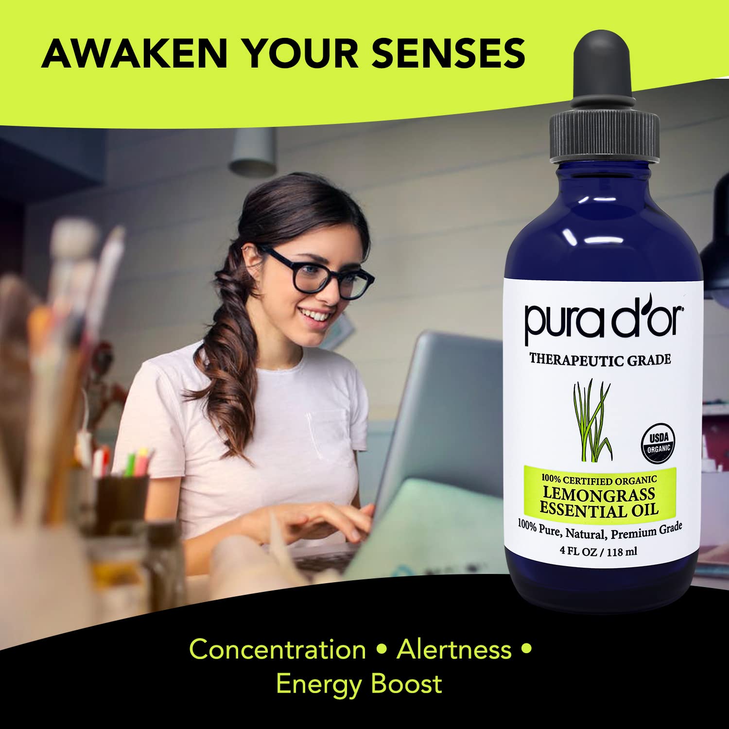 PURA D'OR Organic Lemongrass Essential Oil, 4oz, Therapeutic Grade, for Hair, Body, Skin, Aromatherapy, Relaxation, Massage, Vitality, Home, DIY Soap
