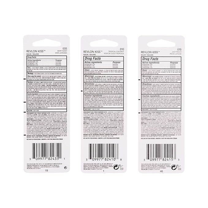 Revlon Lip Balm, Kiss Tinted Lip Balm, Face Makeup with Lasting Hydration, SPF 20, Infused with Natural Fruit Oils, 3 Piece Set, Juicy peach, Berry Burst & Coconut, 0.09 Oz
