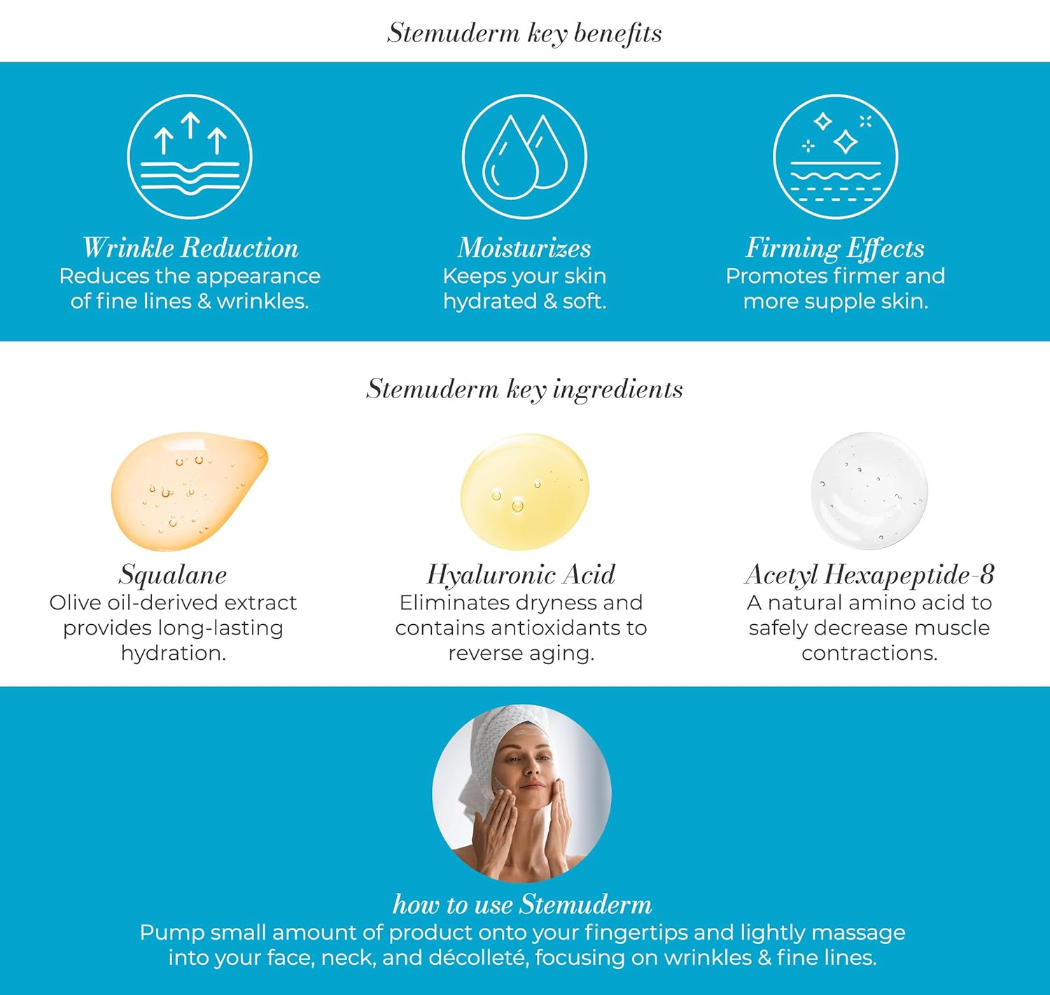 - MUSCLE CONDITIONING - The Stemuderm Formula Includes Peptides That Work Beneath Your Skin To Inhibit Repetitive Muscle Contractions And Movements That Stress And Age Your Skin.