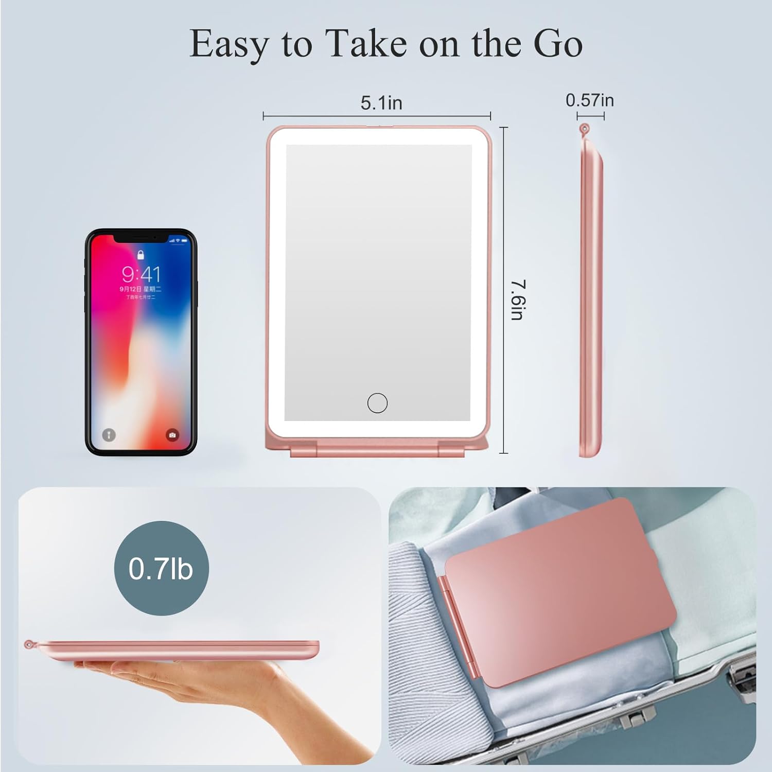 - 5.【Simple and Easy to Carry 】- Compact and portable folding design, you can easily put the light up mirror into your handbag or luggage for perfect travel use.We have the patent of this product, any counterfeit is not allowed.
