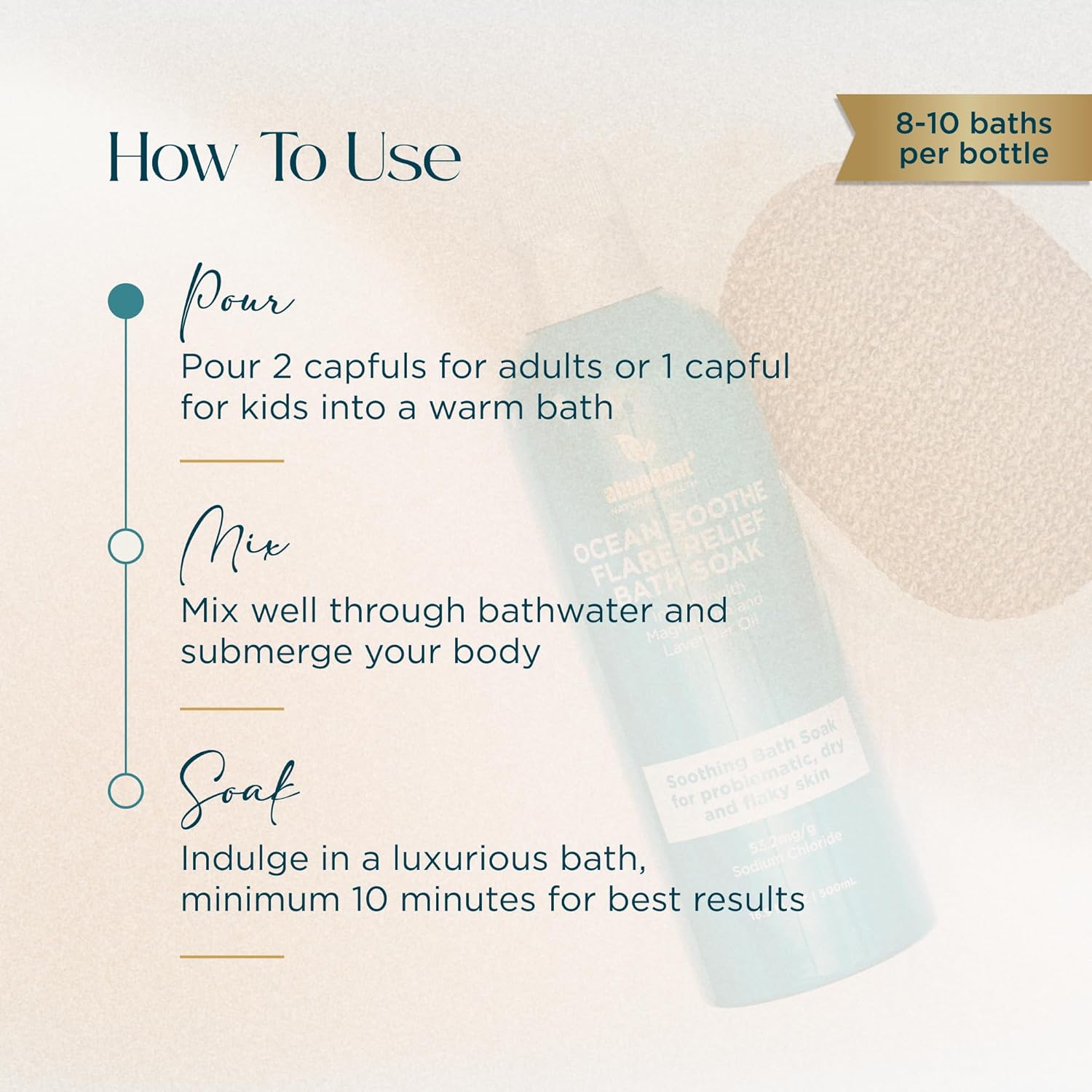 - OCEAN SOOTHE FLARE RELIEF BATH SOAK leave your dry and flaky skin feeling moisturized and soothed with this deeply calming bath soak. Formulated with highly concentrated 99% pure magnesium salt and lavender oil to enhance hydration and promote skin regeneration