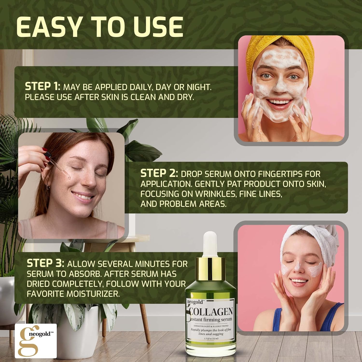 - EFFECTIVE INGREDIENTS – Neogold Collagen Serum is formulated with the perfect combination of effective anti aging + skin tightening ingredients, including Collagen, Peptides, Niacinamide, Glycerin, Hyaluronic Acid, Vitamin C, & Aloe Vera, which all deeply moisturize skin, improve elasticity, & help prevent moisture loss. Ideal for all skin types, this formula brims with clean, fast-acting vitamins & minerals that effectively help soften, firm, & lift skin for vibrant, supple features.