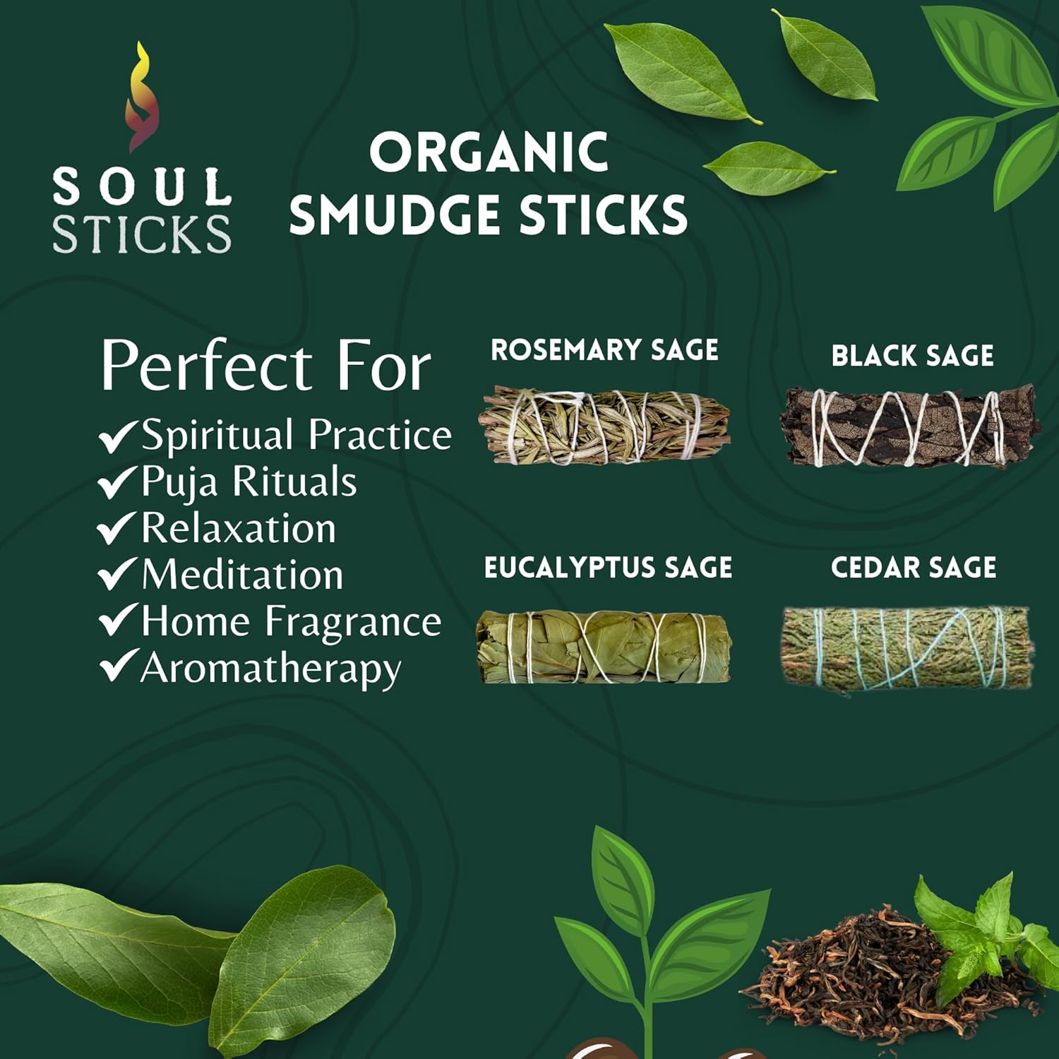 - 6 PACK SMUDGE VARIETY: includes 4 inch variety of each: Dragon's Blood, Black Sage, Rosemary, Eucalyptus, Cedar, and Blue Sage.