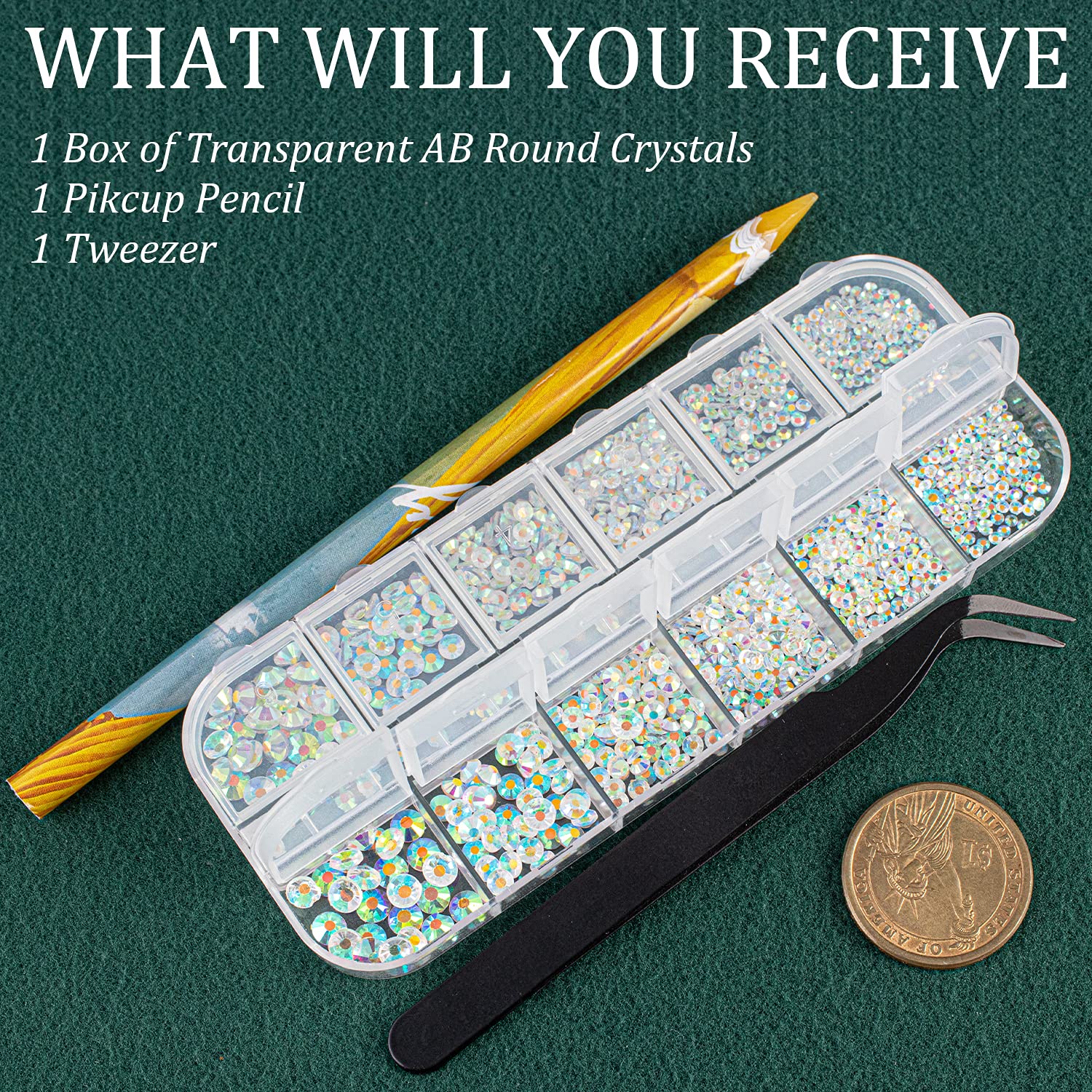 - ❤WHAT YOU WILL RECEIVE -- 1 Box of 6 Sizes Transparent AB Round Glass Nail Crystal Rhinestones Beads (Totally About 1720 PCS); 1 PCS Rhinestone Picker Pencil; 1 PCS Tweezer. The Well Equipped Rhinestone Set Is Suitable for Both Professional Nail Technician and Inexperienced Starter for Nail Art.