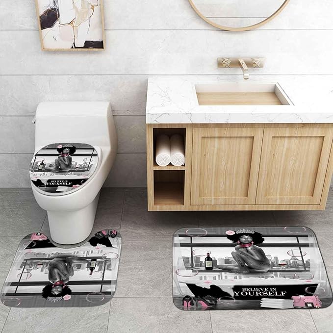 4PCS Sexy Black Girl Shower Curtain Set, Romantic Pink Floral High Heels Bubble Red Wine Afro Lady African American Woman Inspirational Quotes Bathroom Decor, Non-Slip Bath Rugs, Get Naked