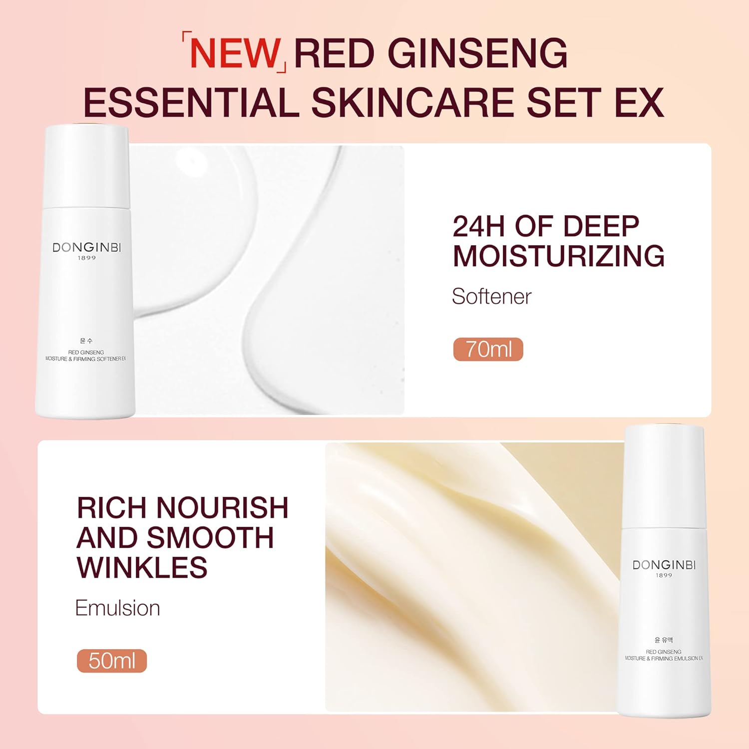 - All In One Care Set: The skin care set contains a 70ml of 1899 Single Essence EX, 50ml of Moisture & Firming Softner, 50ml of Moisture & Firming Emulsion, 50ml of Red Ginseng Micro Cleansing Foam EX. All our skin products are rich in Korean 6-year-old red ginseng extracts which can help protect the skin, strengthen the skin barrier, and help reduce the visibility of wrinkles.