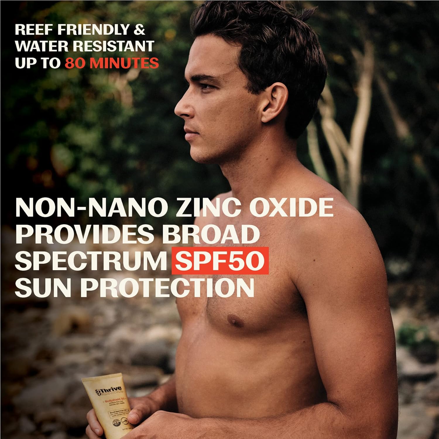 - NATURAL SPF PROTECTION - SPF 50 Sunscreen powered by Thrive’s antioxidant rich Costa Rican super-plants, Juanilama, Fierrillo & Coralillo, delivered in a tube made from recycled plastic, for a lighter environmental footprint. Our regenerative plant-derived formula helps restore skin from sun exposure.