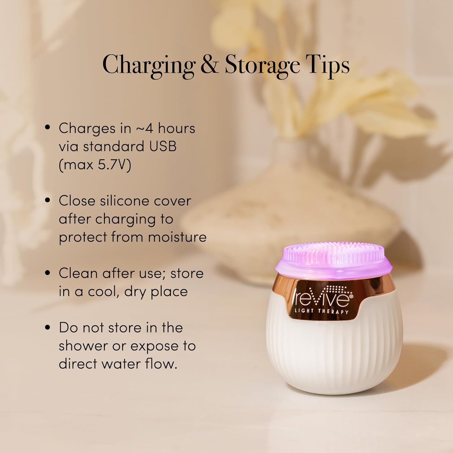 - Rechargeable LED Facial Light Therapy - This facial cleansing brush charges fully in ~4 hours via USB (5.7V max). Always seal the silicone cover before storing. Do not store these face tools for skincare in the shower.