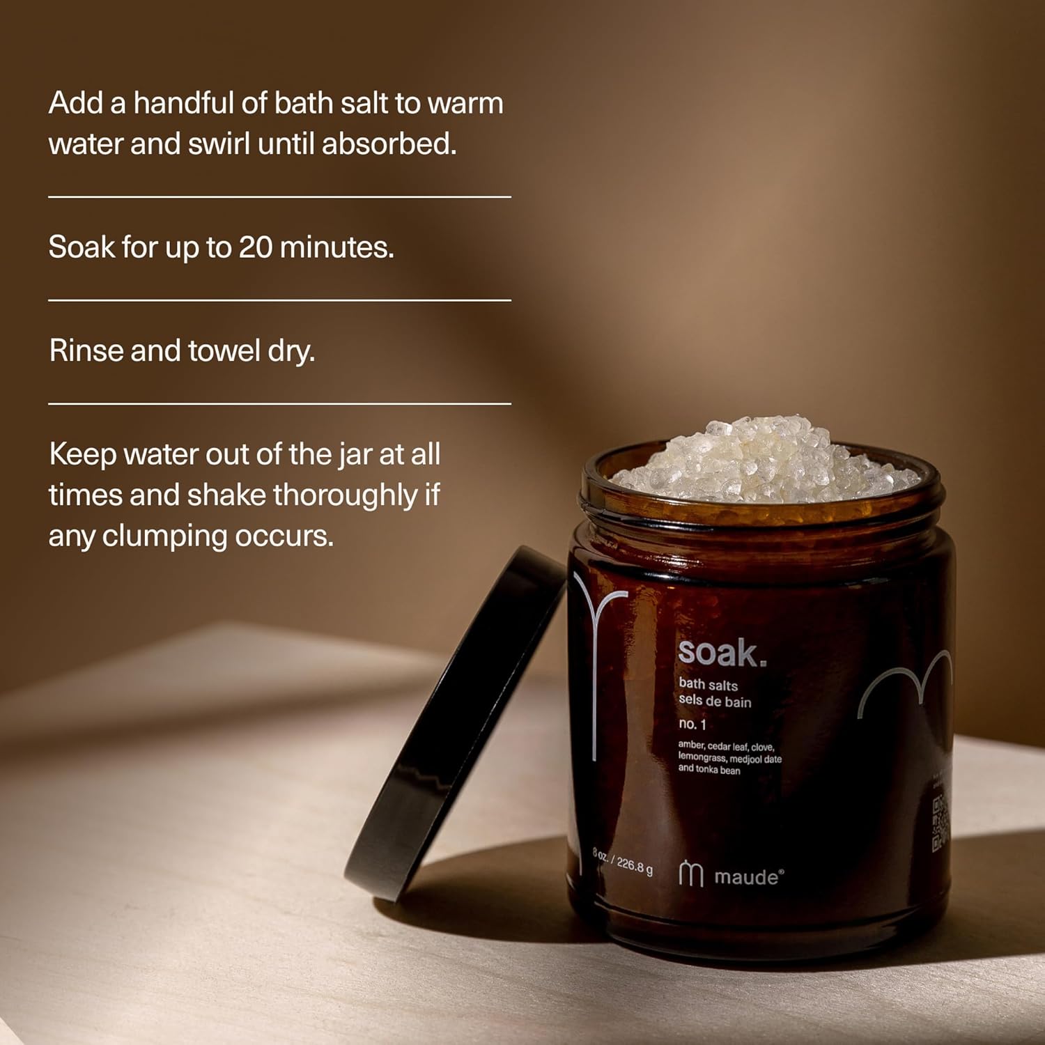 Maude Soak No. 1 - Nourishing Mineral Bath Salts - Hand-Harvested Dead Sea Salt with Magnesium & Potassium Chloride - Soften & Rejuvenate Skin - Notes of Amber, Cedar Leaf & Clove (8 oz)