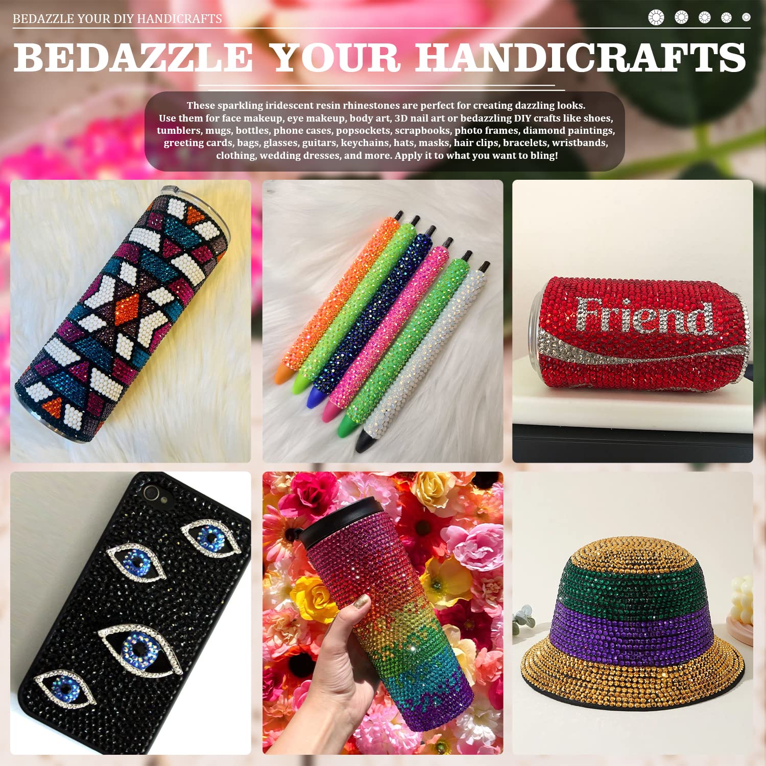 - 💎WIDE APPLICATION -- These sparkling iridescent resin rhinestones are perfect for creating dazzling looks. Use them for face makeup, eye makeup, body art, 3D nail art or bedazzling DIY crafts like shoes, tumblers, mugs, bottles, phone cases, popsockets, scrapbooks, photo frames, diamond paintings, greeting cards, bags, glasses, guitars, keychains, hats, masks, hair clips, bracelets, wristbands, clothing, wedding dresses, and more. Apply it to what you want to bling!