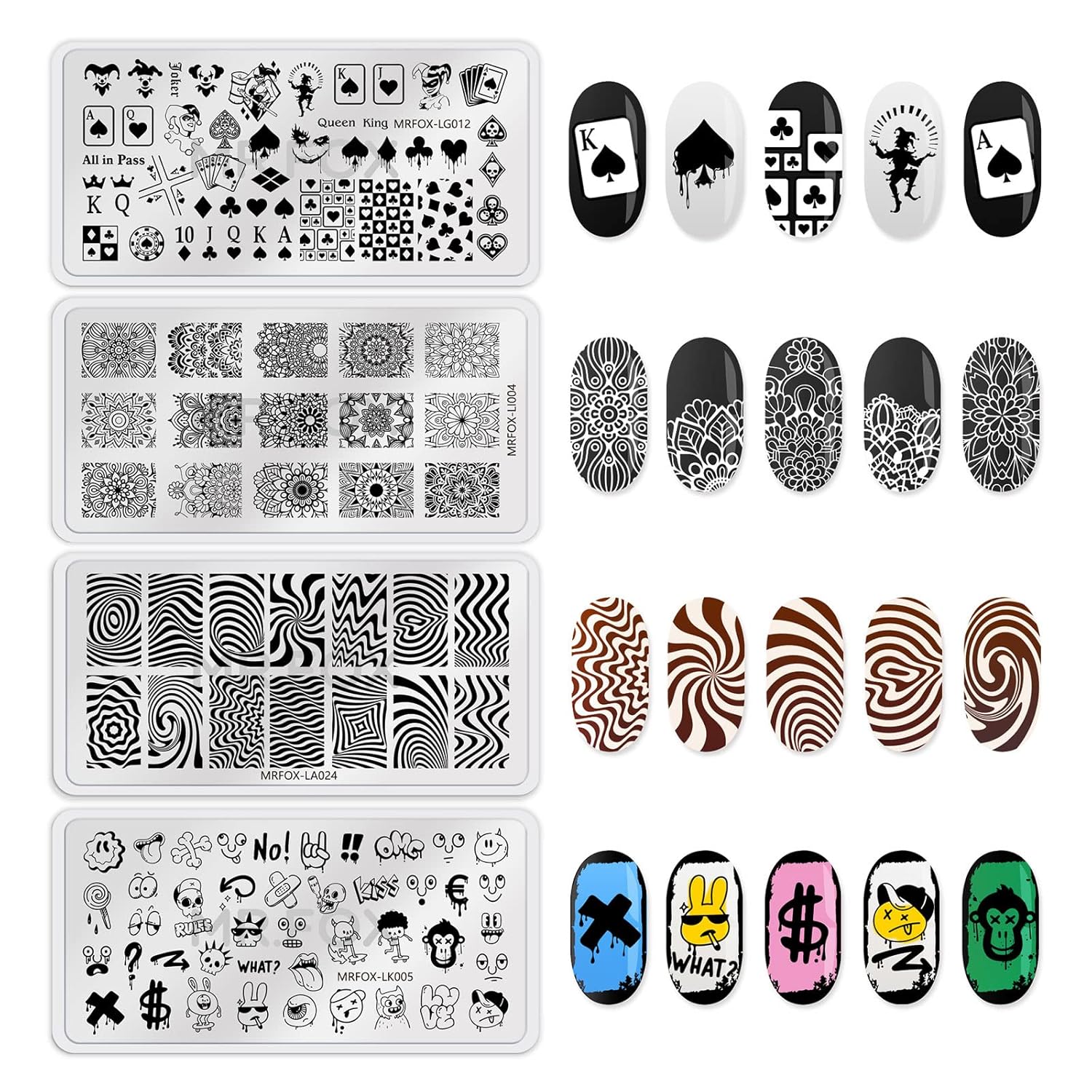 - ? ¡¾ 8 PLATES of PATTERNS ¡¿The nail art templates included 8 plates with a variety of cute designs such as Pumpkin, Skull Bat, Poker, Latte, etc. You can use them all on your nails and still look coordinated and together to fit lots of occasions or holidays.