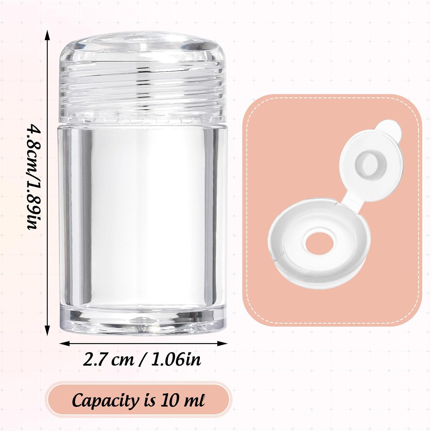 - Diameter: 2.7 cm / 1.06'', Height: 4.8cm/1.89'' . and the capacity is 10 ml; Portable size is easy to carry and good for going out.