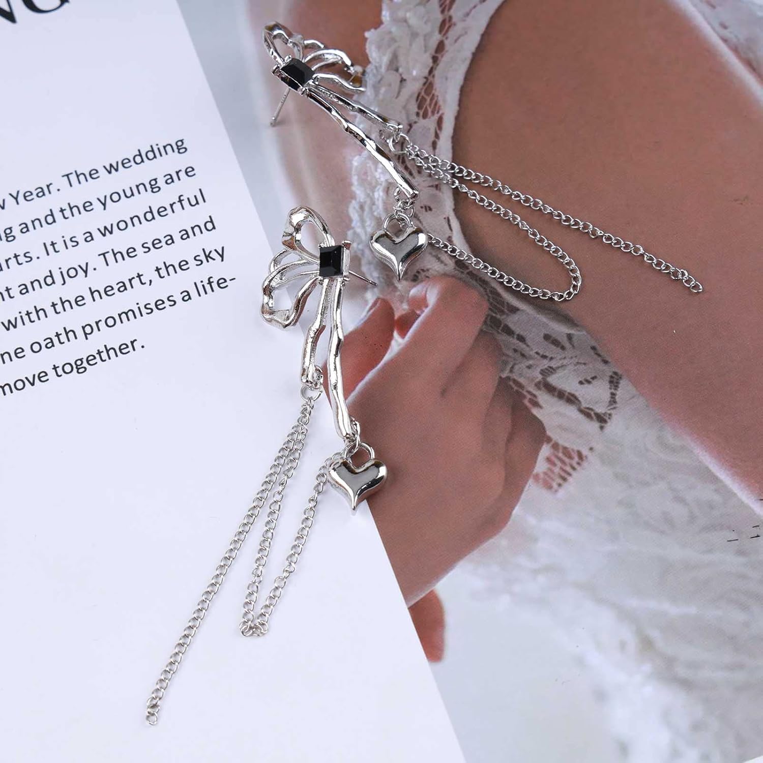 Vintage Butterfly Dangle Earrings Long Butterfly Chain Tassel Earrings Silver Puffy Heart Drop Earrings Black Onyx Butterfly Earrings Jewelry for Women