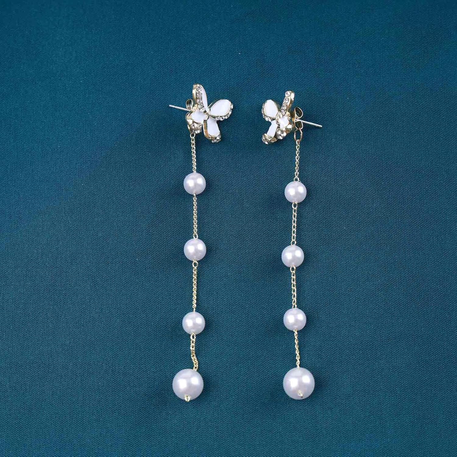 Vintage Crystal Butterfly Pearl Earrings Long pearl Drop Earrings Gold Pearl Tassel Chain Earrings Sparkly Cz Butterfly Stud Earrings Jewelry for Women