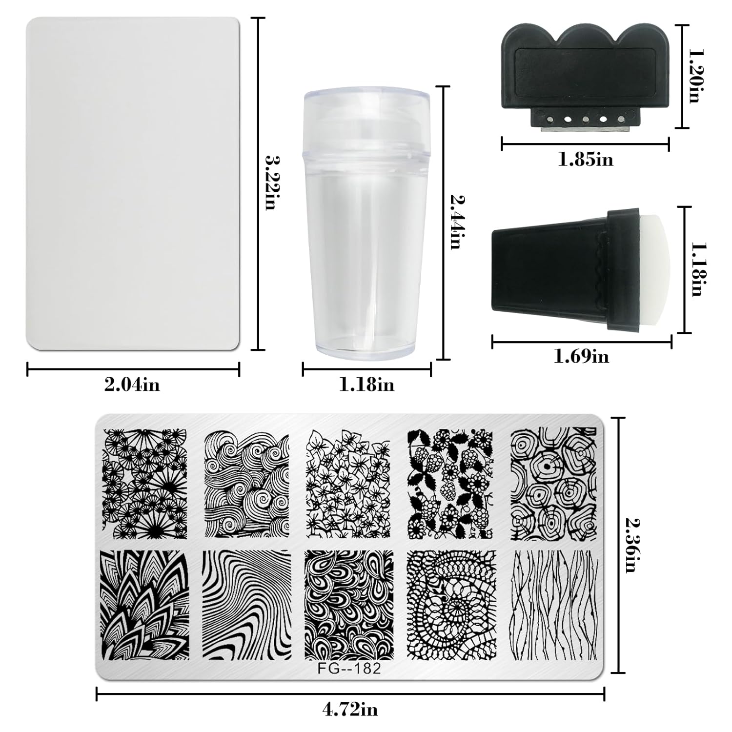 - Included Components : 7* Stainless steel nail stamping plate, 2* Clear stamp, 2 scraper