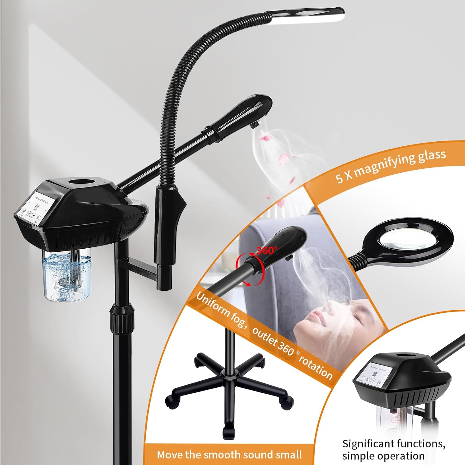 - ⭐【Little Working Voice】–Facial Steamer on wheels When moving, it is smooth and the sound is small, which will not affect the guests. The sound of the machine running in the work will be very small,After the timing ends, it will make a tinkling prompt!