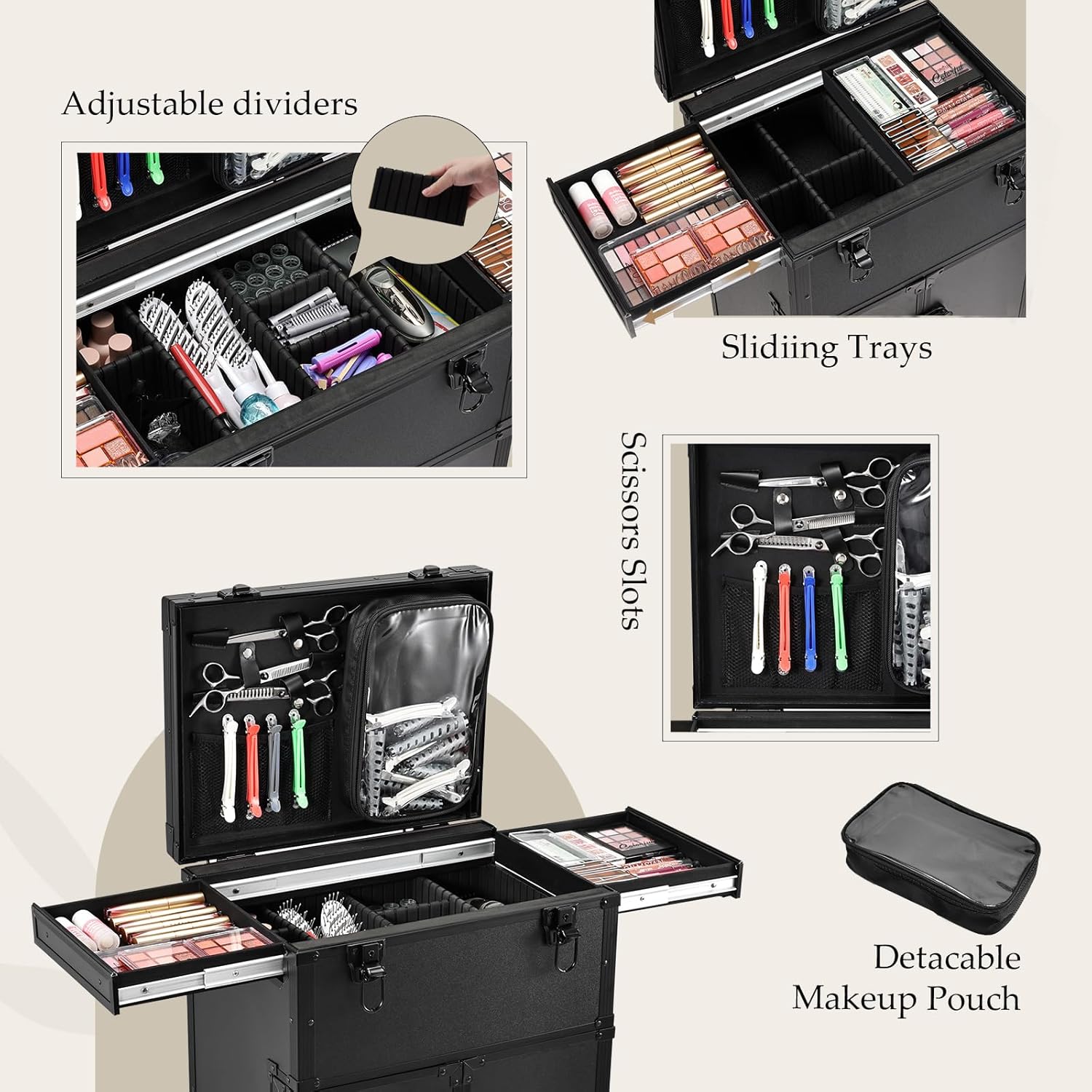 - Convertible Makeup Station: This makeup rolling case is a Convertible Makeup Station, the ultimate answer to your cosmetic needs. With 2 sliding flat trays for a temporary worktop, 4 large drawers set transformed into shelves, and 2 side doors providing steady balance, this makeup case is your versatile solution for seamless beauty sessions.