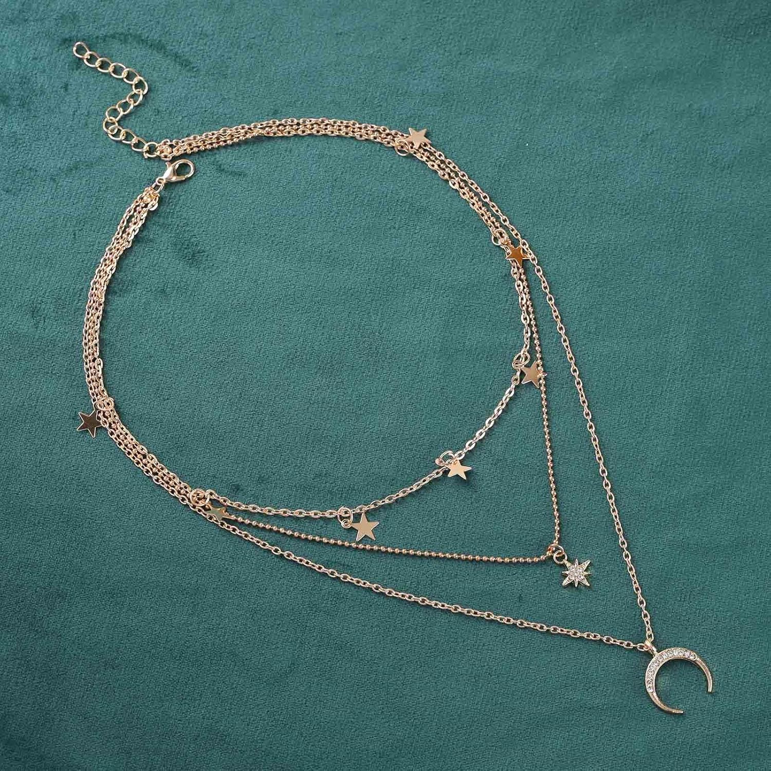Boho layered moon star choker necklace crystal northstar necklace cz moon pendant necklace gold star dangle necklace jewelry for women