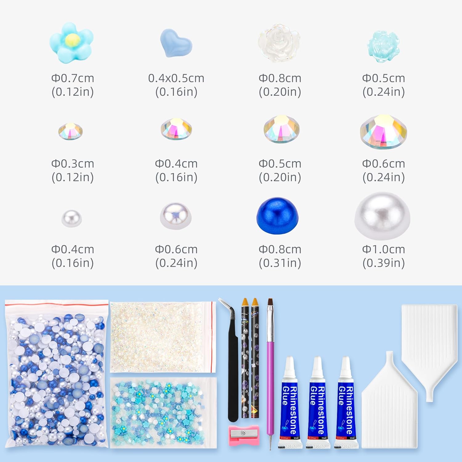 160g Blue White Flat Back Pearls Rhinestones with Gel for Crafts Mixed Size 3mm-10mm AB Color Round Half Pearls Flatback Pearl Beads and Resin Rhinestones Set for Face Art