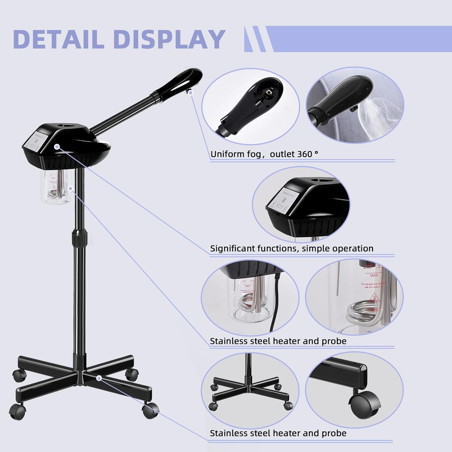 - 【Facial Steamer Professional】This facial steamer has an upgraded atomizing cartridge, 360°rotatable nozzle, adjustable height from 36-51 Inches, 360°rotatable and smooth wheels. Suit your different needs.