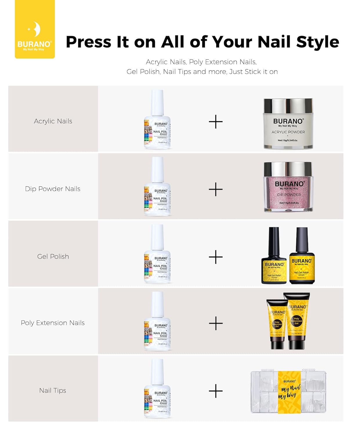 BURANO Nail Art Nail Foil Glue Gel, o.5 oz with 10PCS Foil Stickers Set Nail Foil Glue for Nails Foil Transfer Gel, Nail Design DIY UV LED Lamp Required (Popular Foil 12)