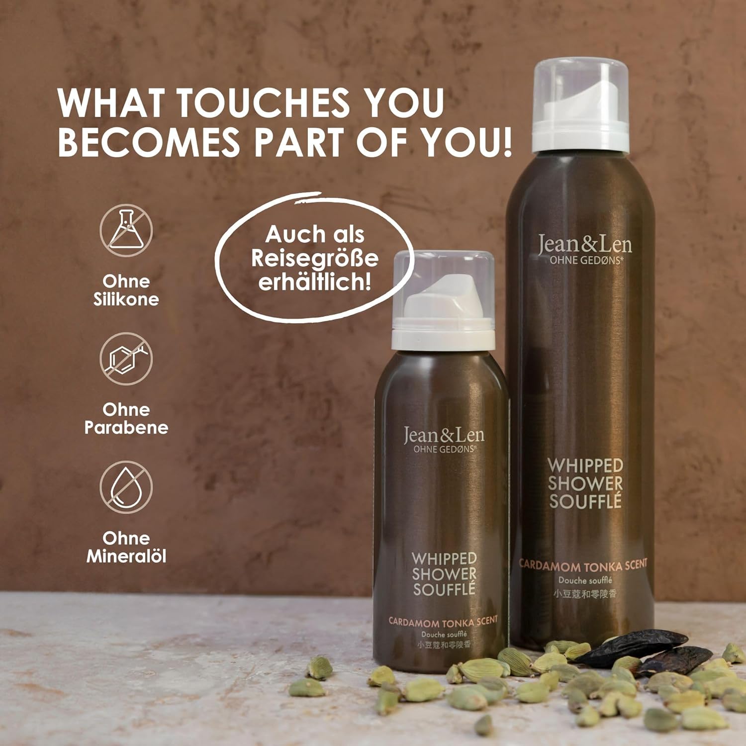 Jean & Len Shower Soufflé Cardamom & Tonka, almond, jojoba and babussa oil, for a fragrant cleansing experience, for normal to dry skin, shower foam, without parabens & silicones, vegan, 6.76 Fl. Oz.