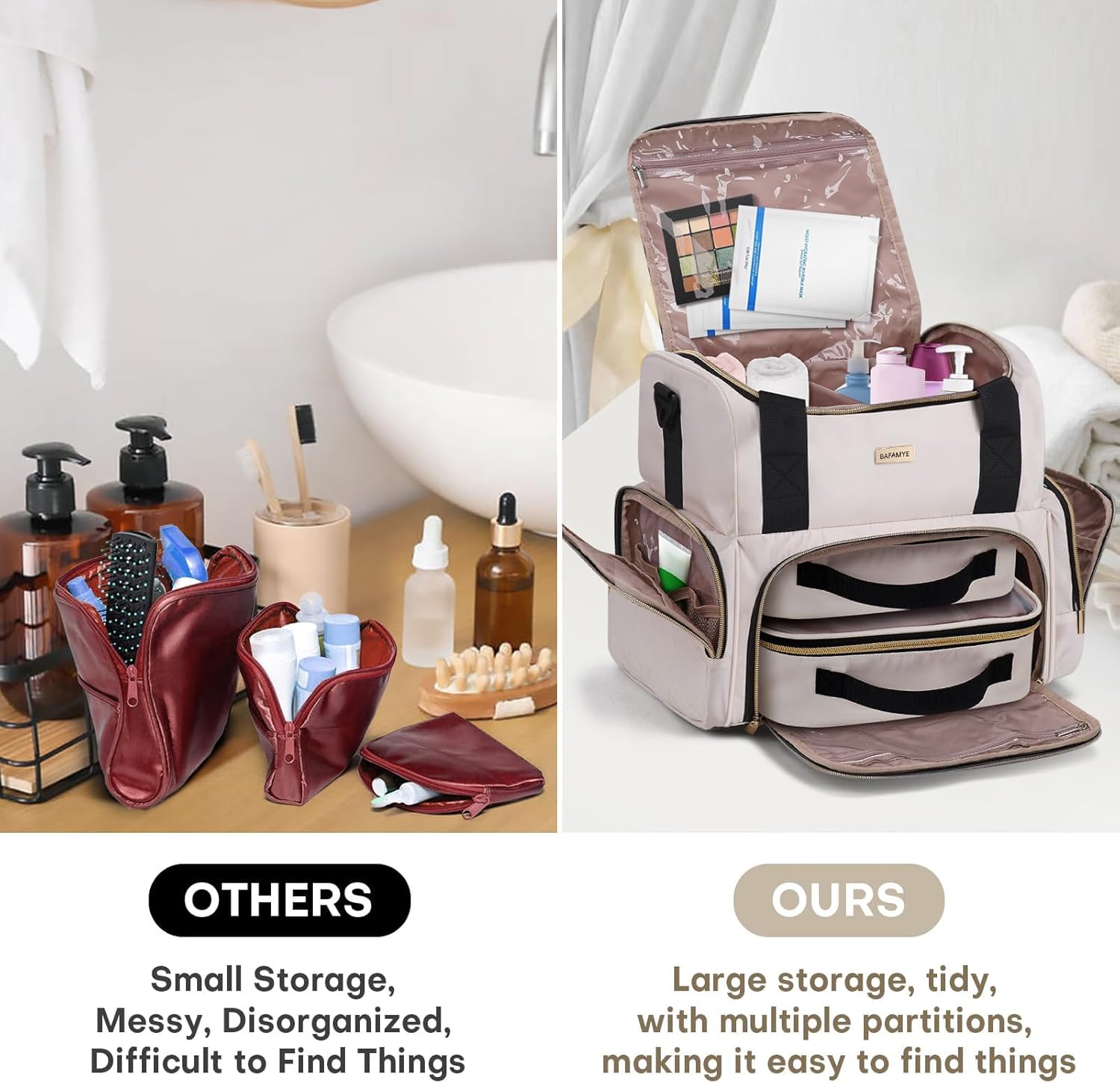 - MULTI POCKET: There are three small and one large compartments on both sides of the pockets, and the mesh design keeps them upright. You can use it to distinguish between toiletries and cosmetics, as well as to store small items