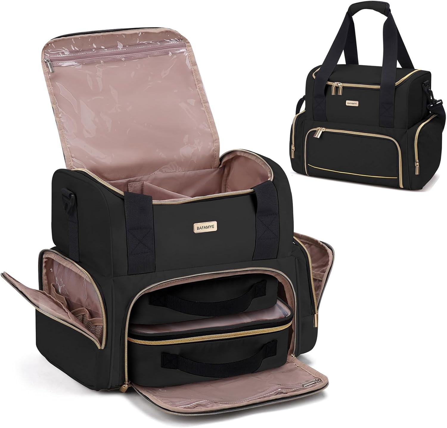 - 2 INDIVIDUAL CASE : Bottom compartment contains 2 large case (9.5”x7.5”x3.4”to classify your cosmetic and keep them in order. Each case is designed with a clear window for easy-to-find items at a glance and can be used individually.A transparent zipper pocket inside for storing samples or small stuff