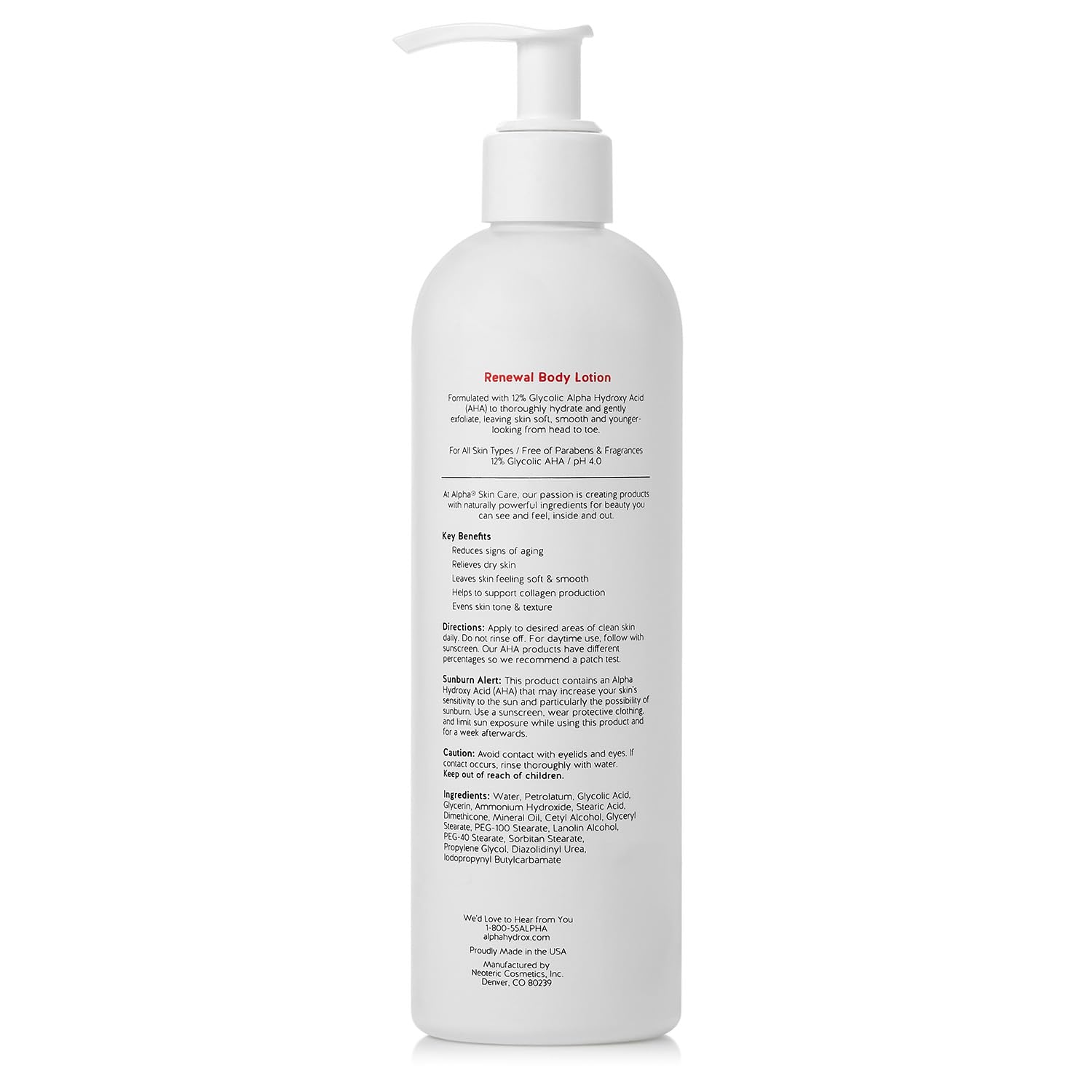- Anti-Aging Formula: This body lotion is formulated with 12% Glycolic Alpha Hydroxy Acid (AHA) and a pH level of 4.0 to help reduce the appearance of fine lines and wrinkles. AHA promotes skin renewal by encouraging cell turnover, improving elasticity, and smoothing skin texture. Ideal for those looking to hydrate while gently exfoliating, this lotion helps restore a youthful appearance. Regular use supports collagen production, leaving skin feeling firmer, softer, and more radiant over time.