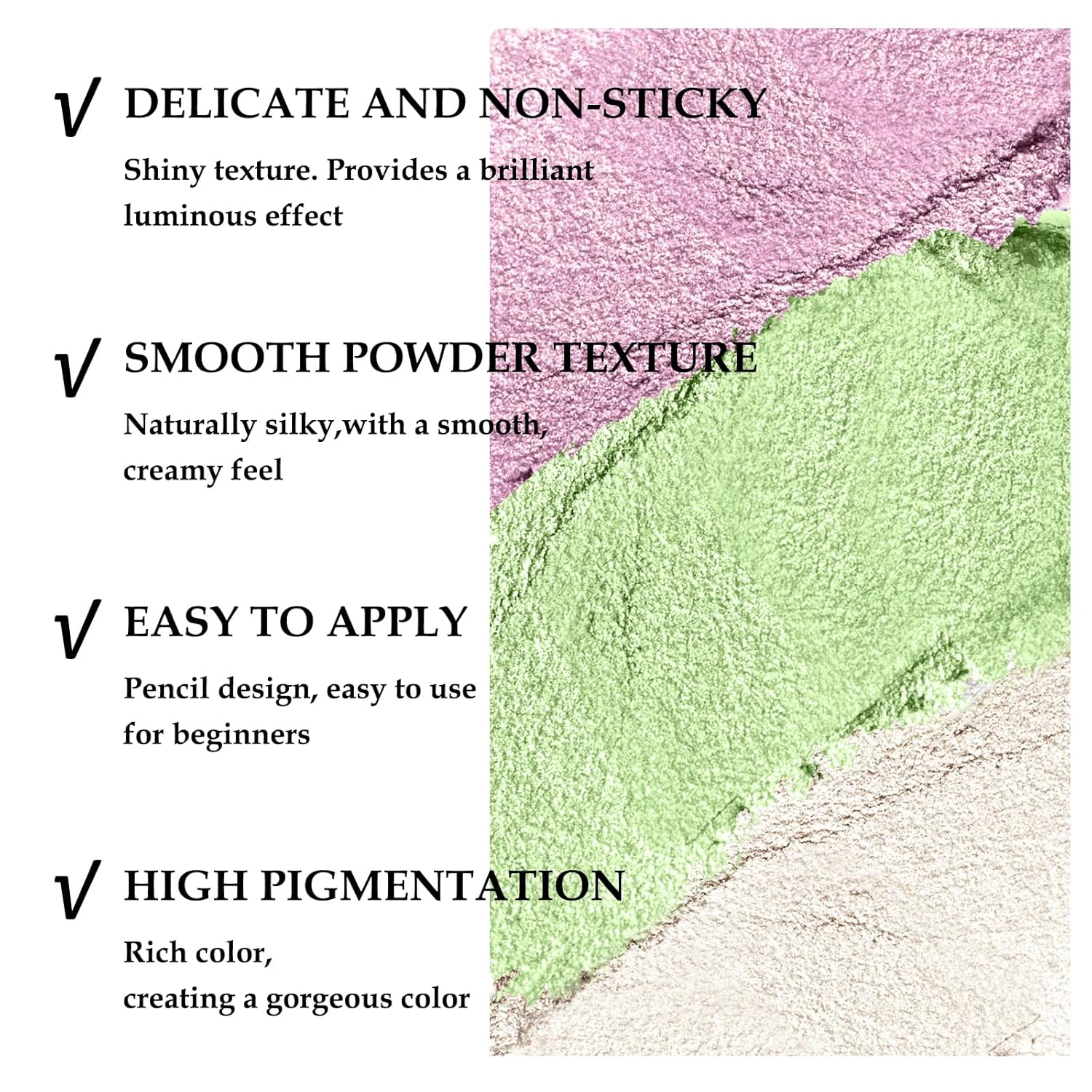 - Eye Highlighter Stick: Glitter Eyeshadow Pen has a shimmer color. You can easily apply a gradient look with it. Multiple colors for you to choose from to create different eye makeup.
