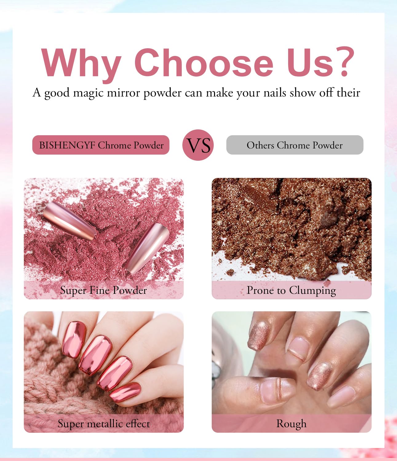- Metallic Mirror Finish: Our Chrome Powder for Nails has sparkle and super mirror effect, like mirror-like metallic texture! It makes your nails look glittery, show elegant and stunning, like a "fairy" thanks to its astonishing chrome effect. And this glittery effect lasts for more than 28+ days.