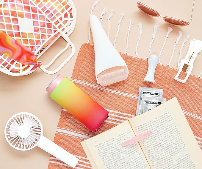 - STAY COOL & SWEAT FREE β It comes with 2 different facial rollers β a refreshing ice roller to keep you cool & an oil-absorbing roller to stay dry! We have also included a cute, mini rechargeable fan for on-the-go or just for lounging & our cute slim can cooler ties it all together!