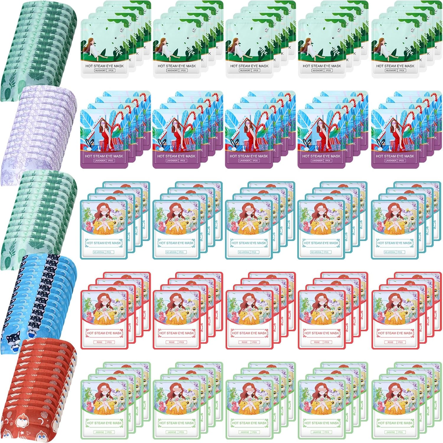 - Self Heating Steam Eye Masks for Dry Eyes: you will receive 60 packs of disposable warming eye masks in 5 scents: mugwort, lavender, jasmine, rose, unscented, 12 pieces of each scent; This mask is helpful to relieve your dry eyes and eye fatigue, improve your sleep quality; Warm tips: this steam eye mask contains botanical ingredients (mugwort, lavender, jasmine, rose), but the fragrance is not obvious; The ear hooks are attached to the side of the eye mask and can be easily peeled off