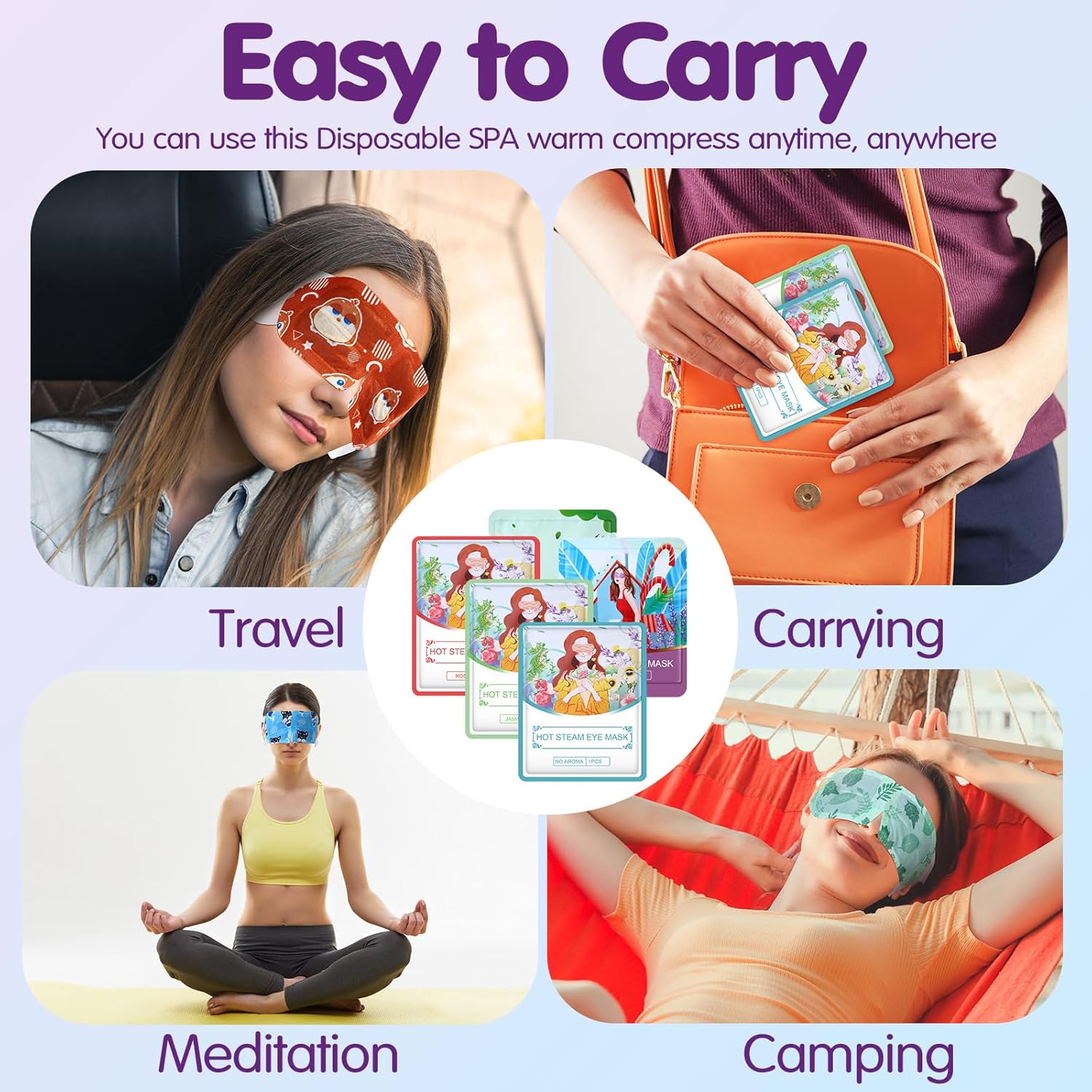 - Easy to Carry: each one of the spa eye mask bulk is self packing and sealed tight; It's convenient to carry out; And each heated eye patch is disposable and convenient for you to carry and use when going out; You can use the steam eye mask anytime and anywhere to relieve your eye pressure and enjoy a relaxing moment