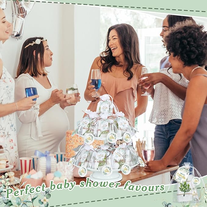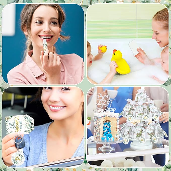 • Complete, Delightful Baby Shower Favors: this set of baby shower favors is a thoughtfully curated selection of 60 lip balms, 60 eucalyptus leaf soaps, 60 fake eucalyptus leaves, 60 charming keychains, 60 white organza bags and 60 thank you tags; These baby shower favor gifts, bulk packaged, are an ideal way to greet, commemorate, and thank your precious guests