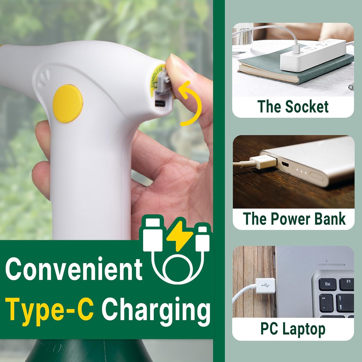 - ăRechargeable & Last LongăThis electric sprayer bottle comes with a Type-C USB cable but CHARGER IS NOT INCLUDED. The charge port hidden on the handle is well covered for watering-proof consideration. Charging the battery to full will last this electric plant sprayer working for a long time.