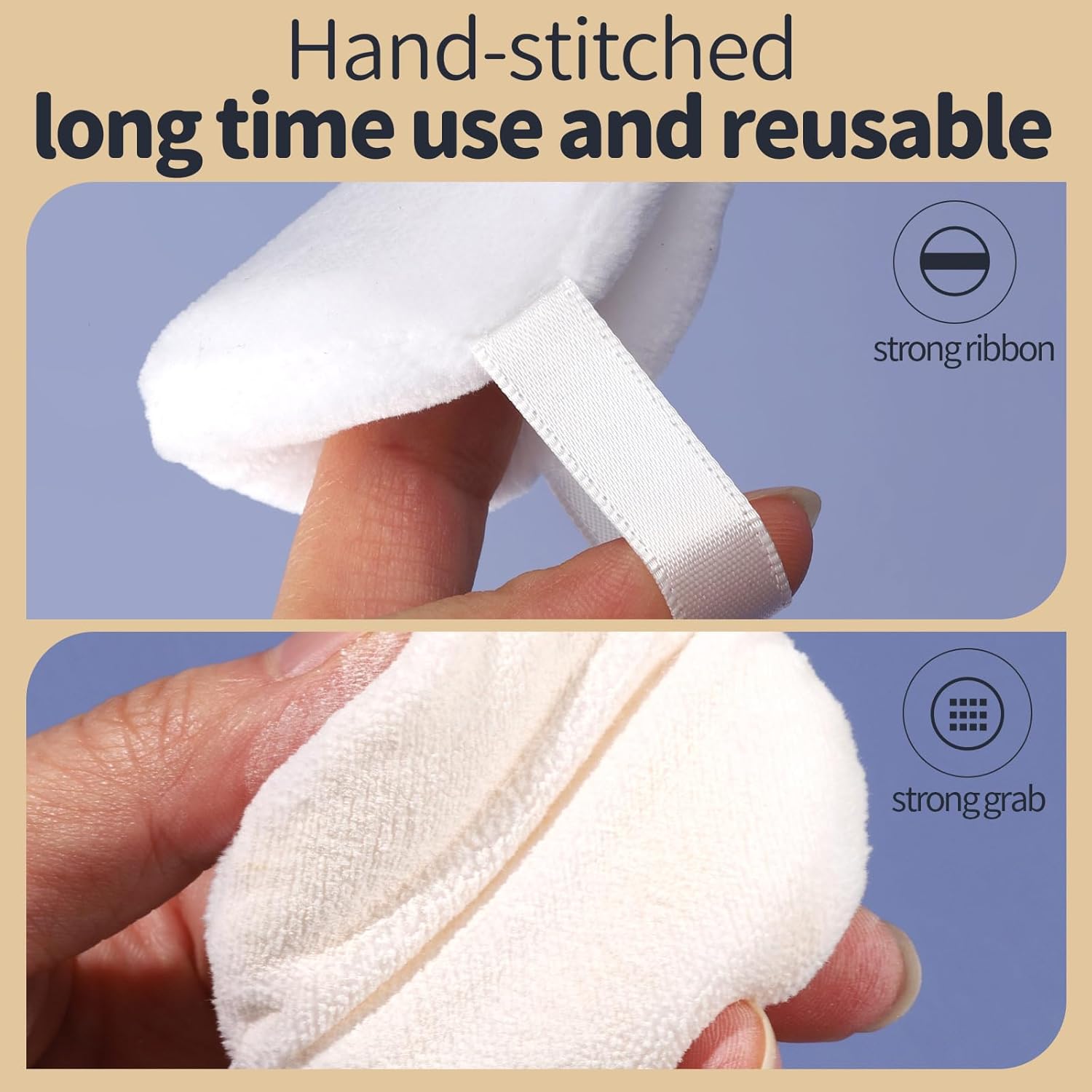 - Strong Grab Makeup Puffs: The fabric has 1.2 mm of fluff, can well catch and hold the powder, minimize the makeup wastage and evenly apply powder on your face. Our small powder puffs are hand-sewn and washable, and the sturdy ribbon design is easy for you to hold, ensure a better control and make a more precise apply. Essentials for your makeup routine