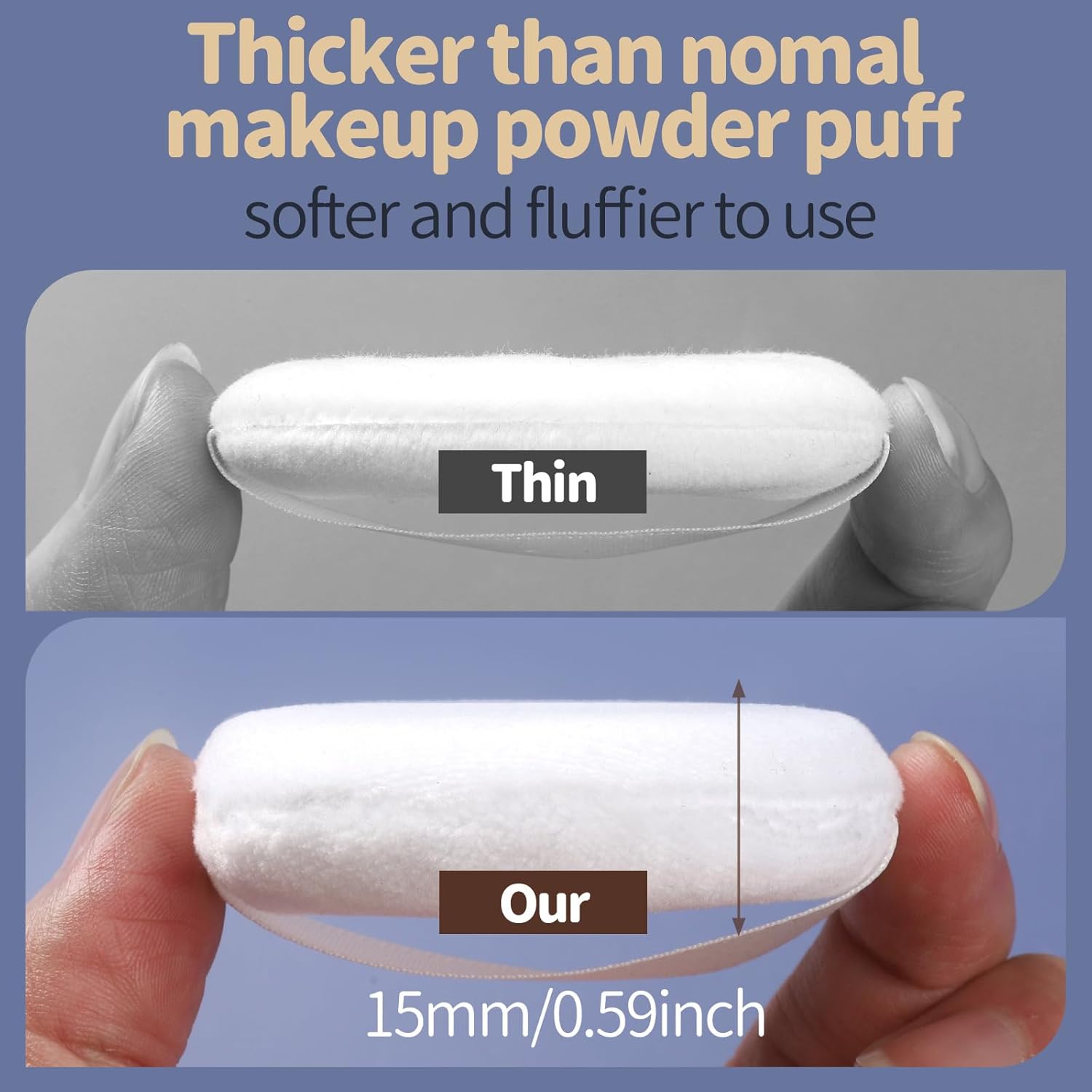 - Soft and Fluffy Face Powder Puff: Our face powder puffs are 6 cm in diameter and 15 mm thick, customized thickened, made of quality fabrics and sponge, can be used on both sides and reused for long time. Very fluffy and soft, skin-friendly and comfortable when apply face powder on your face
