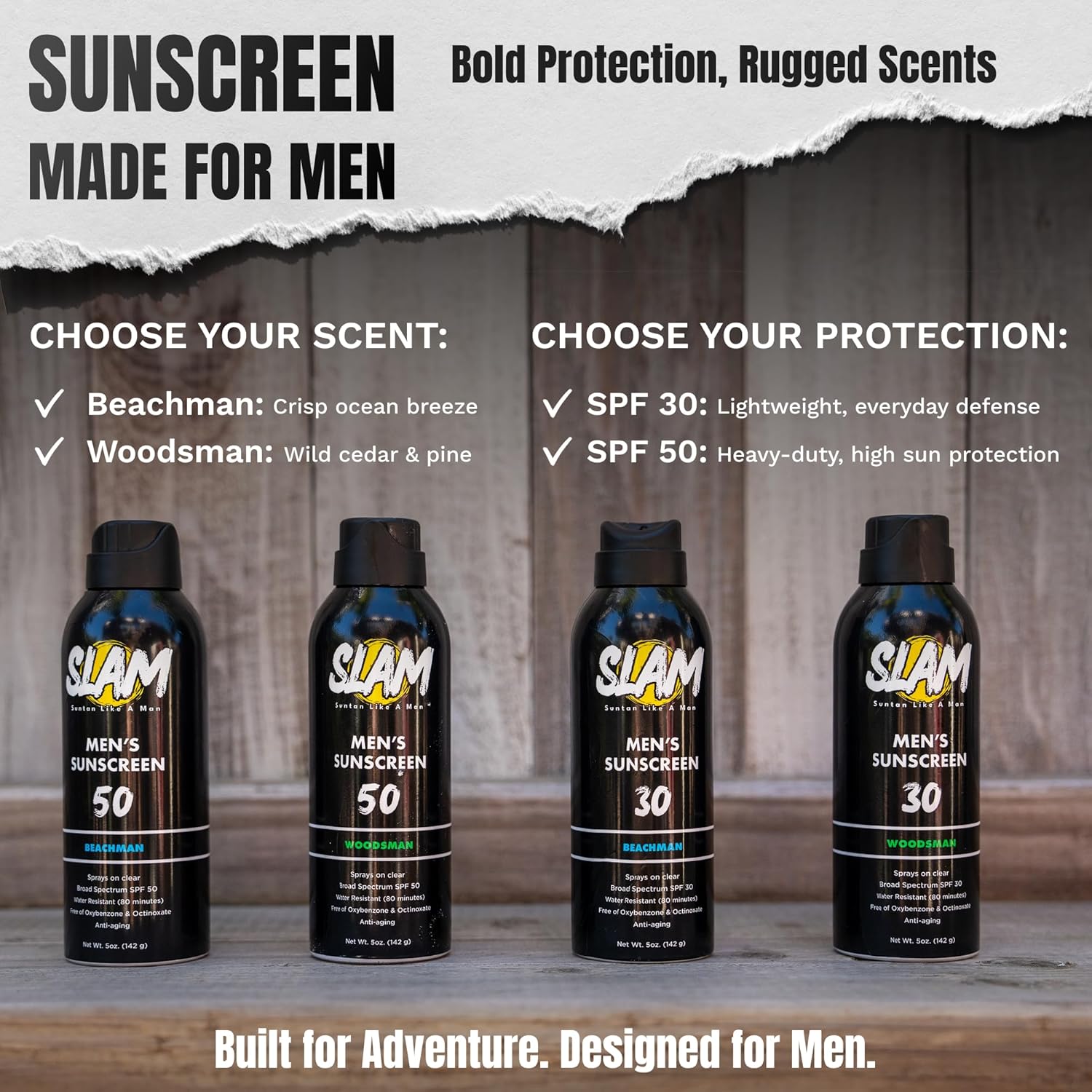 SLAM WoodsMan Men's Scented Sunscreen Spray SPF 50 – Broad Spectrum Sun Screen for Face & Body, Waterproof & Sweat Resistant Spray Sunscreen SPF 50, UVA/UVB Protection, Mens Sunblock