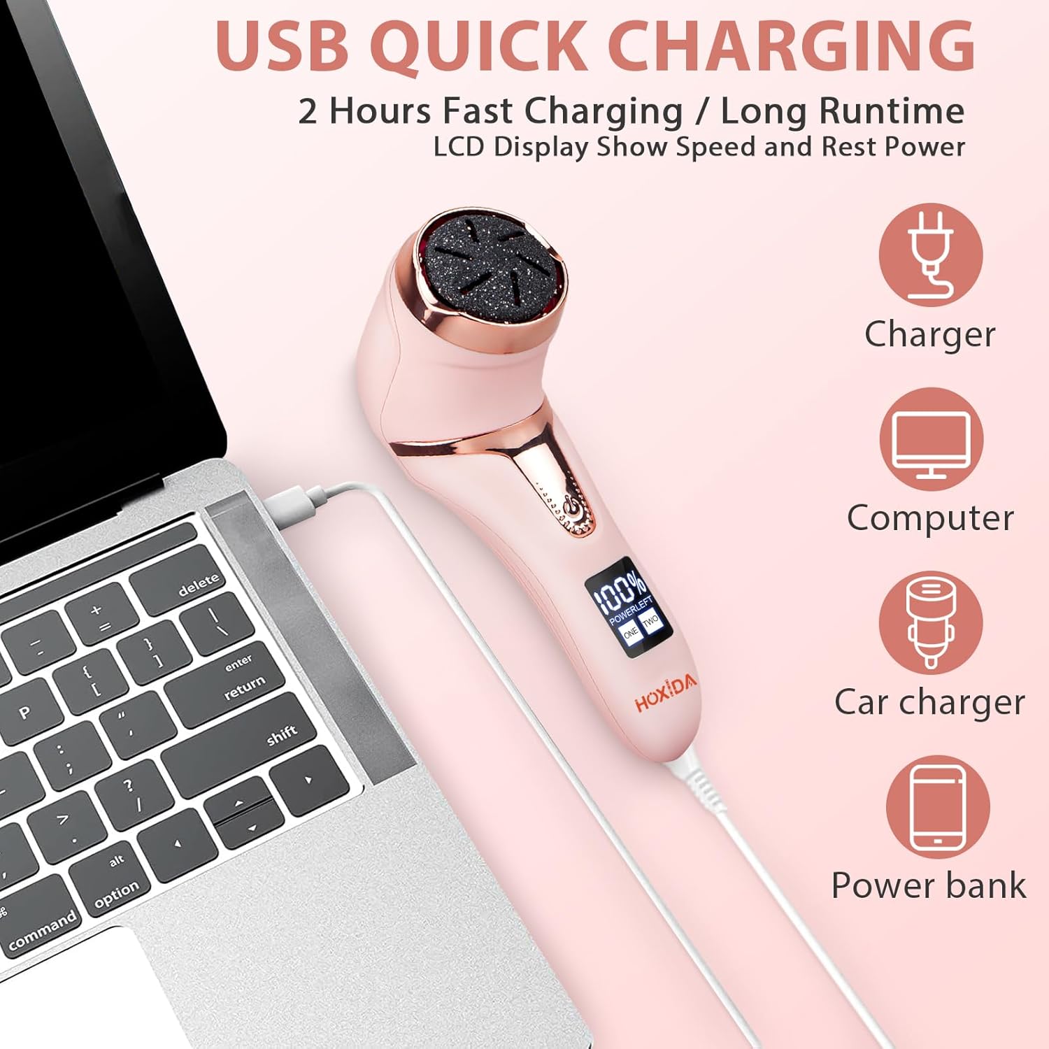 - Rechargeable, Long-Lasting, Easy to Use ----Included USB charging cable, This electric foot file can be charged via any USB port, and have a long runtime 2hours after full charged .and this dead skin remover for feet have LCD Power display let you clear know the rest power it left. remind you charge in time