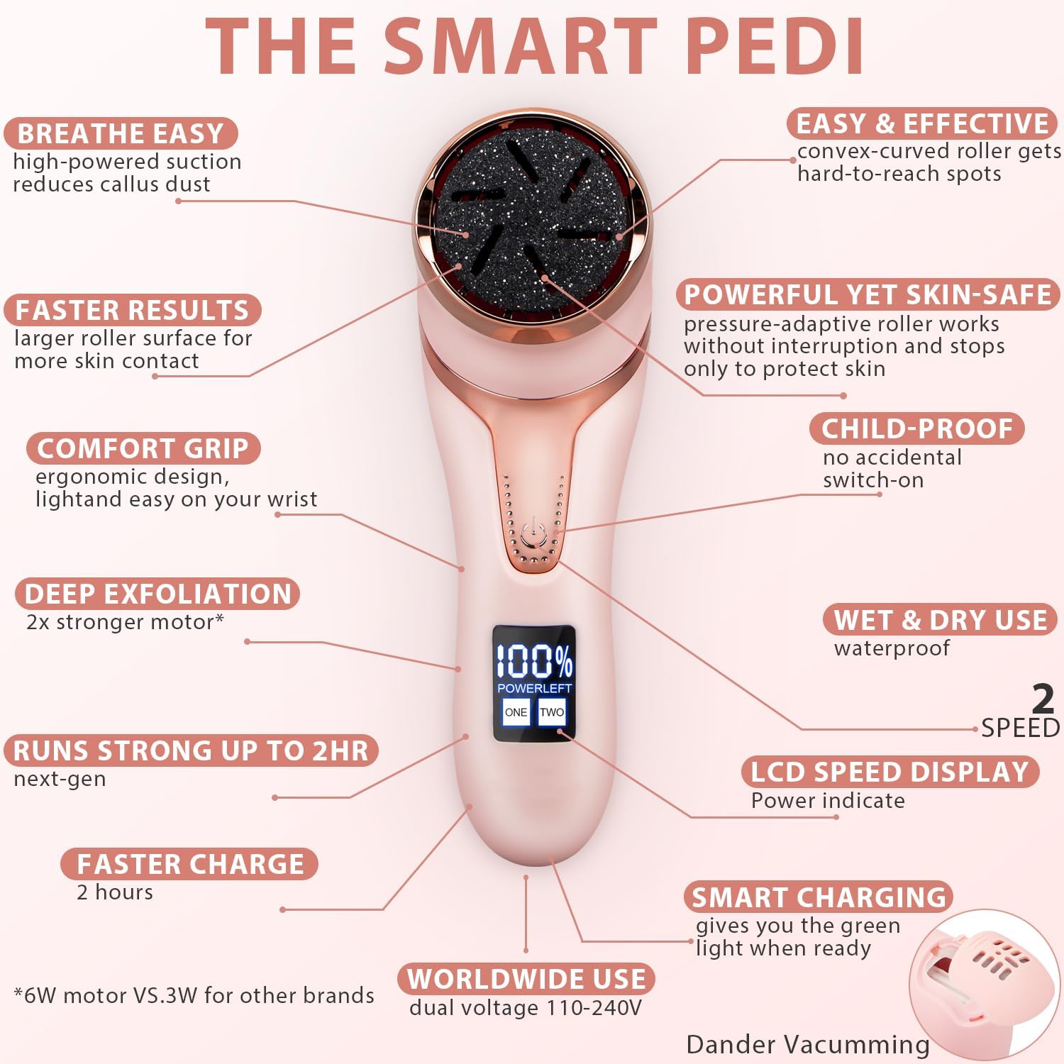 - Pedicure kit with 9 Grinding Head, 2 Speed, with VACUUM ABSORPTION----- 9 Quartz Crystals Removable Roller Heads and 2 Speed Correspond to the roughness required to remove the calluses on the feet. UPGRADE powerful callus remover with dander vacuum cleaner quickly sucks away foot scraps, cle.an and hygienic, and sucks while grinding. dust-free, and foot scraps will not be scattered in air or floor, an essential home pedicure kit for people who has cleanliness.
