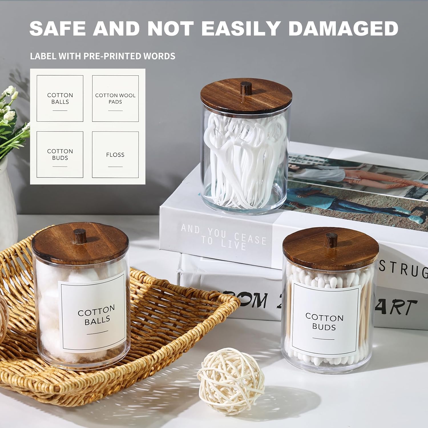 - FOOD GRADE MATERIAL: The q tips holder is made of food-grade plastic, thick clear plastic looks like glass or acrylic, but it is more drop-resistant than glass, easy to use and clean. The lid is made of natural wood, a very natural decorative element, while being practical, it also makes the jar more beautiful, which is suitable for many scenes.