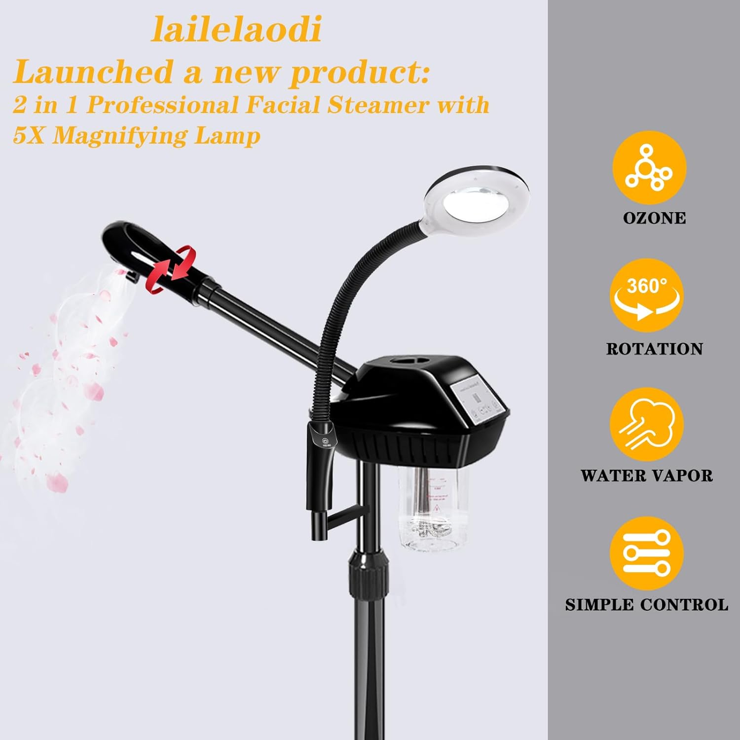 - 【5X Magnifying Lamp Facial Steamer】 The 5x magnifying with adjustable light and flexible arm, designed for more convenient use, mobile facial steamer with wheels allows you to lie down or sit down to enjoy the spa aromatherapy.