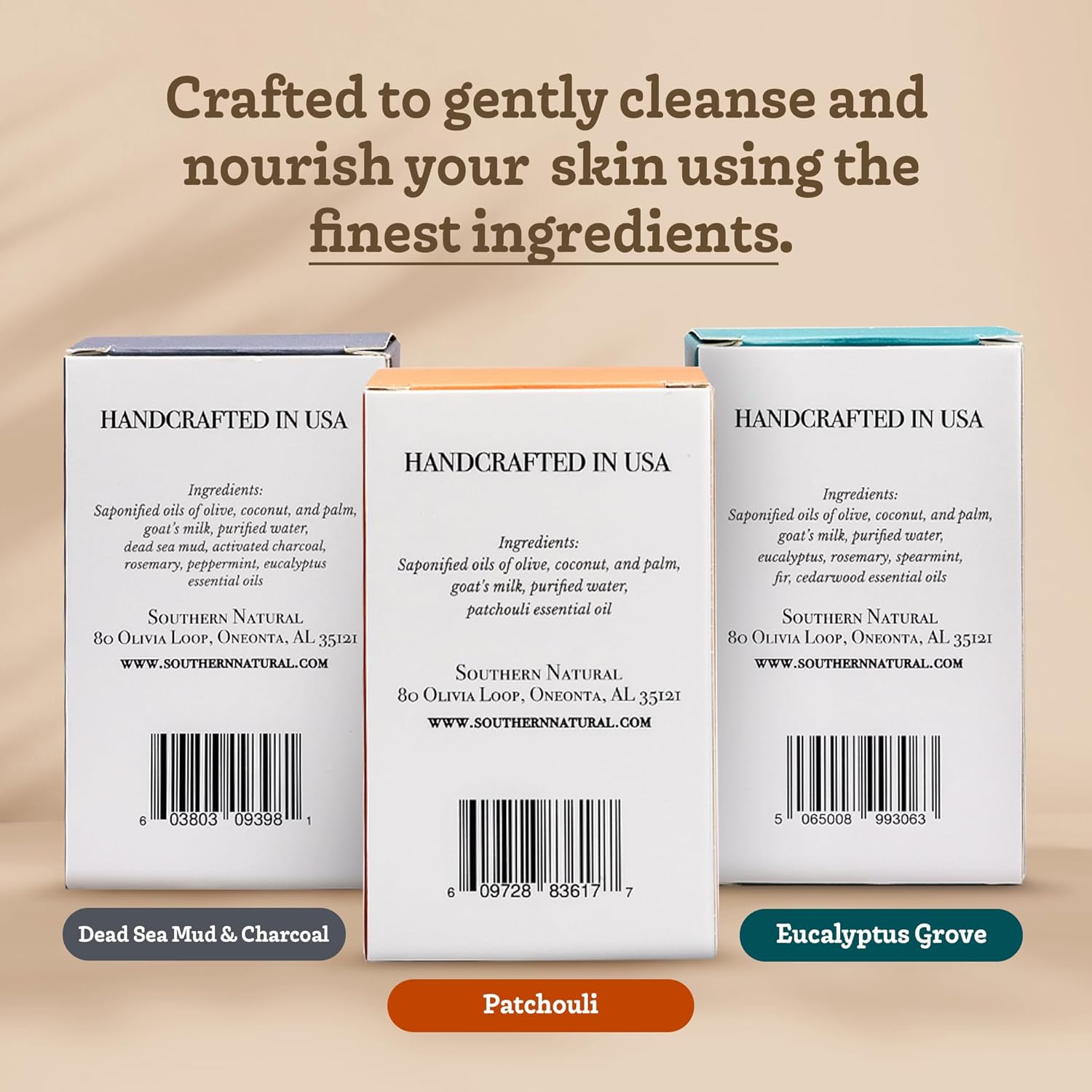 Southern Natural Goat Milk Soap Bar (Variety 3 Pack) Dead Sea Mud & Charcoal, Patchouli, Eucalyptus Grove - For Dry Sensitive Skin. Great For Face and Body.(Each Bar 4-4.5 oz)